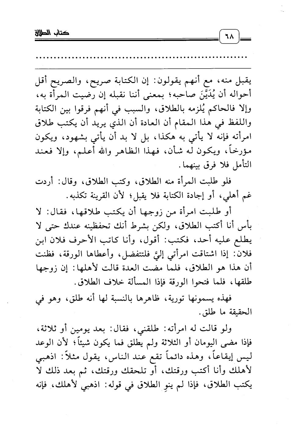 أو طلبت امرأة من زوجها أن يكتب طلاقها، فقال: لا بأس أنا أكتب الطلاق، ولكن بشرط أنك تحفظينه عندك حتى لا يطلع عليه أحد، فكتب: أقول، وأنا كاتب الأحرف فلان ابن فلان: إذا اشتاقت امرأتي إليَّ فلتتفضل، وأعطاها الورقة، فظنت أن هذا هو الطلاق، فلما مضت العدة قالت لأهلها: إن زوجها طلقها، فلما فتحوا الورقة فإذا المسألة خلاف الطلاق.