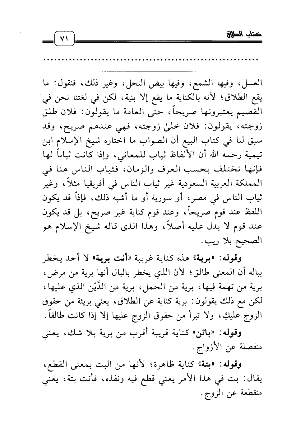 العسل، وفيها الشمع، وفيها بيض النحل، وغير ذلك، فنقول: ما يقع الطلاق؛ لأنه بالكناية ما يقع إلا بنية، لكن في لغتنا نحن في القصيم يعتبرونها صريحاً، حتى العامة ما يقولون: فلان طلق زوجته، يقولون: فلان خلى زوجته، فهي عندهم صريح، وقد سبق لنا في كتاب البيع أن الصواب ما اختاره شيخ الإسلام ابن تيمية رحمه الله أن الألفاظ ثياب للمعاني، وإذا كانت ثياباً لها فإنها تختلف بحسب العرف والزمان، فثياب الناس هنا في المملكة العربية السعودية غير ثياب الناس في أفريقيا مثلاً، وغير ثياب الناس في مصر، أو سورية أو ما أشبه ذلك، فإذاً قد يكون اللفظ عند قوم صريحاً، وعند قوم كناية غير صريح، بل قد يكون عند قوم لا يدل عليه أصلاً، وهذا الذي قاله شيخ الإسلام هو الصحيح بلا ريب.