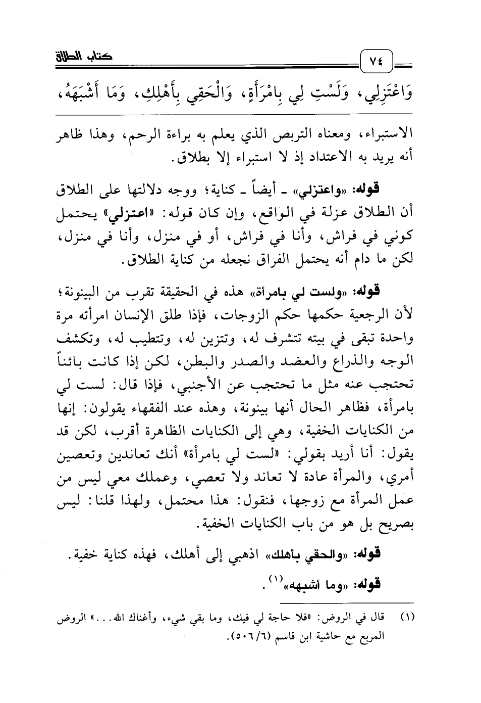 قوله: «واعتزلي» ـ أيضاً ـ كناية؛ ووجه دلالتها على الطلاق أن الطلاق عزلة في الواقع، وإن كان قوله: «اعتزلي» يحتمل كوني في فراش، وأنا في فراش، أو في منزل، وأنا في منزل، لكن ما دام أنه يحتمل الفراق نجعله من كناية الطلاق.