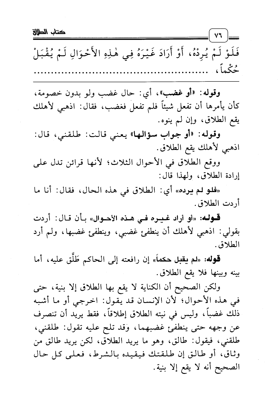 ولكن الصحيح أن الكناية لا يقع بها الطلاق إلا بنية، حتى في هذه الأحوال؛ لأن الإنسان قد يقول: اخرجي أو ما أشبه ذلك غضباً، وليس في نيته الطلاق إطلاقاً، فقط يريد أن تنصرف عن وجهه حتى ينطفئ غضبهما، وقد تلح عليه تقول: طلقني، طلقني، فيقول: طالق، وهو ما يريد الطلاق، لكن يريد طالق من وثاق، أو طالق إن طلقتك فيقيده بالشرط، فعلى كل حال الصحيح أنه لا يقع إلا بنية.