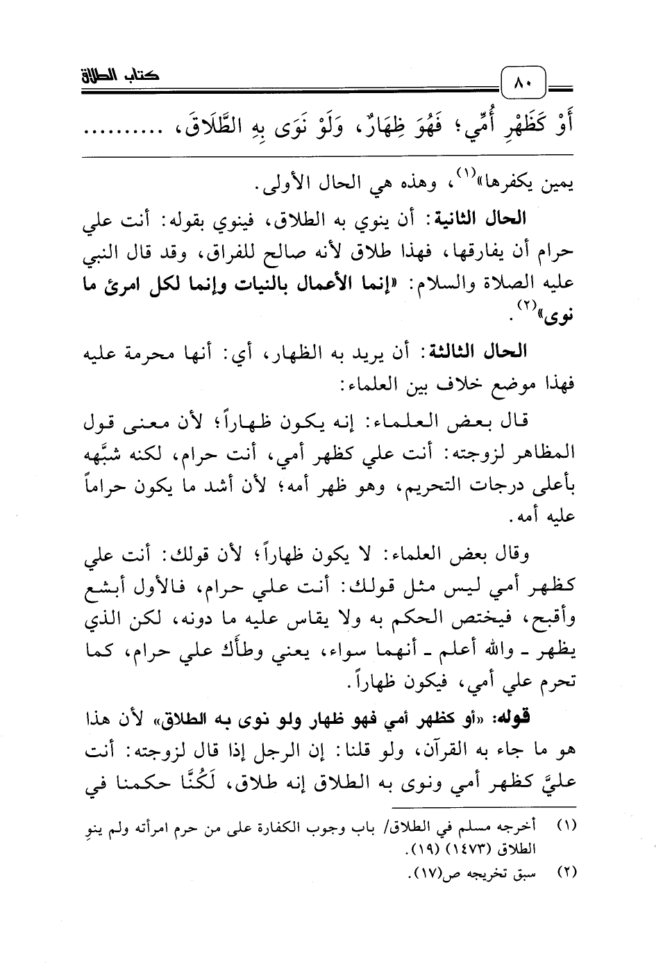 الحال الثانية: أن ينوي به الطلاق، فينوي بقوله: أنت علي حرام أن يفارقها، فهذا طلاق لأنه صالح للفراق، وقد قال النبي عليه الصلاة والسلام: «إنما الأعمال بالنيات وإنما لكل امرئ ما نوى» (¬2).