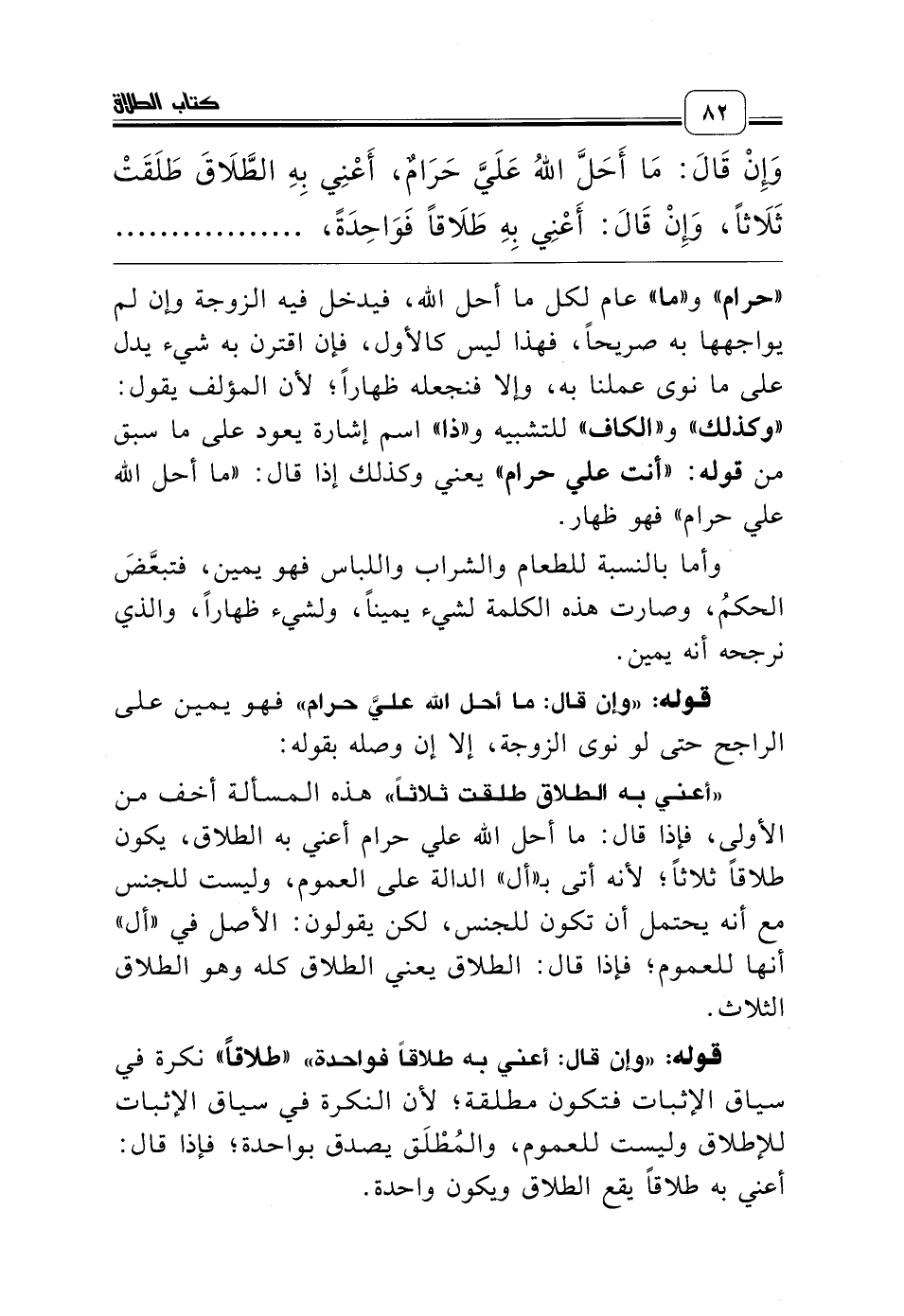 «حرام» و «ما» عام لكل ما أحل الله، فيدخل فيه الزوجة وإن لم يواجهها به صريحاً، فهذا ليس كالأول، فإن اقترن به شيء يدل على ما نوى عملنا به، وإلا فنجعله ظهاراً؛ لأن المؤلف يقول: «وكذلك» و «الكاف» للتشبيه و «ذا» اسم إشارة يعود على ما سبق من قوله: «أنت علي حرام» يعني وكذلك إذا قال: «ما أحل الله علي حرام» فهو ظهار.