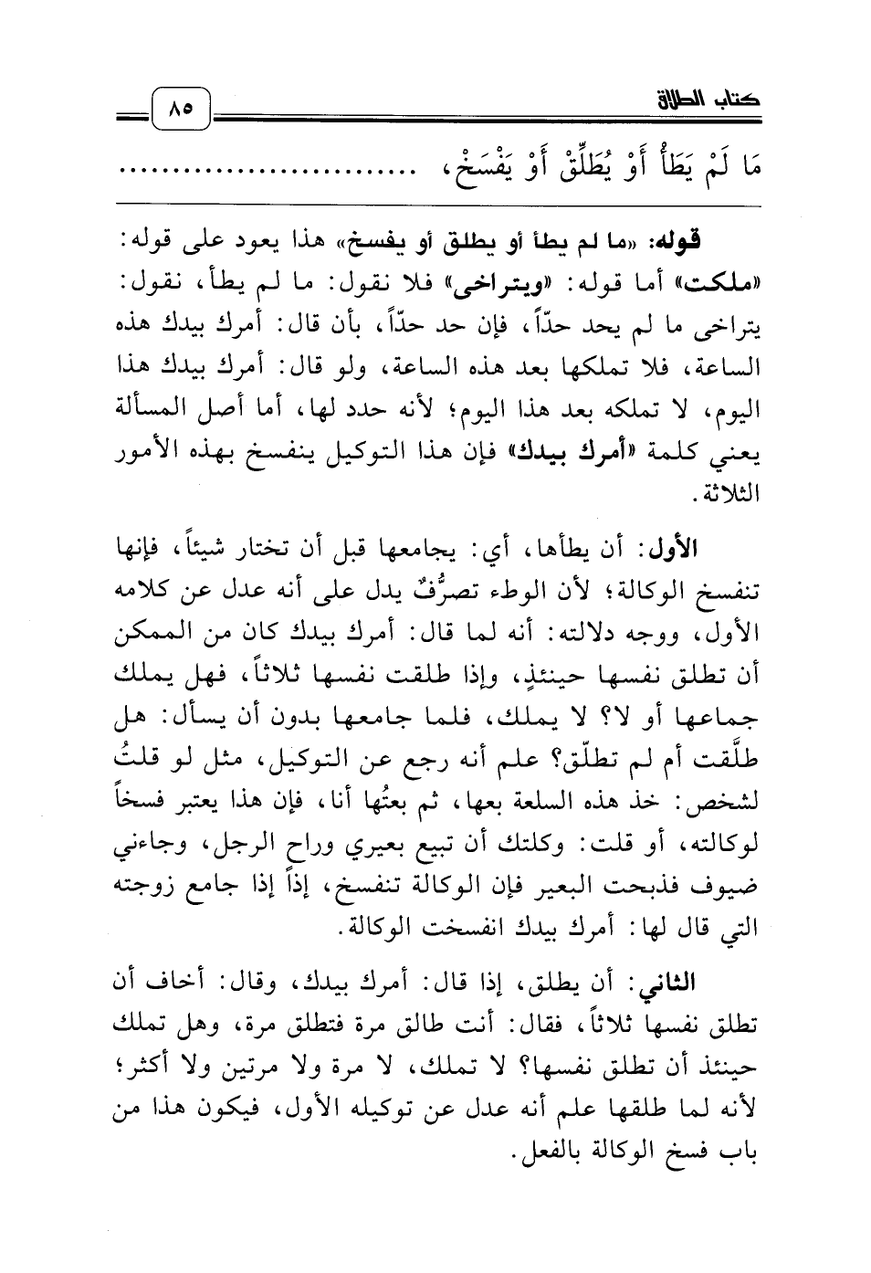 قوله: «ما لم يطأ أو يطلق أو يفسخ» هذا يعود على قوله: «ملكت» أما قوله: «ويتراخى» فلا نقول: ما لم يطأ، نقول: يتراخى ما لم يحد حدّاً، فإن حد حدّاً، بأن قال: أمرك بيدك هذه الساعة، فلا تملكها بعد هذه الساعة، ولو قال: أمرك بيدك هذا اليوم، لا تملكه بعد هذا اليوم؛ لأنه حدد لها، أما أصل المسألة يعني كلمة «أمرك بيدك» فإن هذا التوكيل ينفسخ بهذه الأمور الثلاثة.