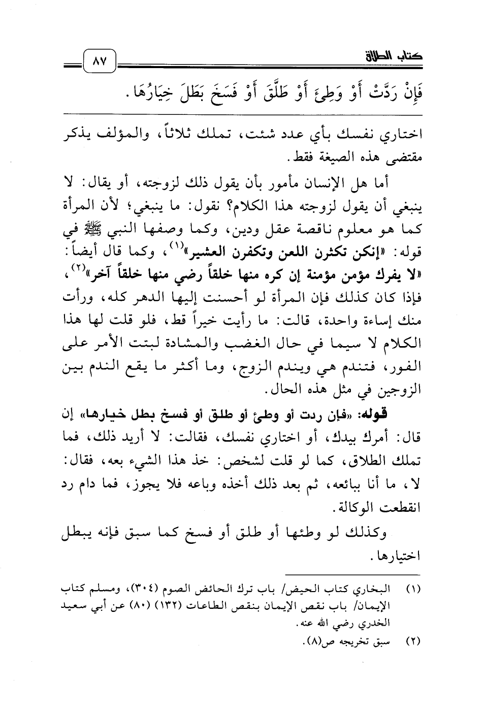 قوله: «فإن ردت أو وطئ أو طلق أو فسخ بطل خيارها» إن قال: أمرك بيدك، أو اختاري نفسك، فقالت: لا أريد ذلك، فما تملك الطلاق، كما لو قلت لشخص: خذ هذا الشيء بعه، فقال: لا، ما أنا ببائعه، ثم بعد ذلك أخذه وباعه فلا يجوز، فما دام رد انقطعت الوكالة.