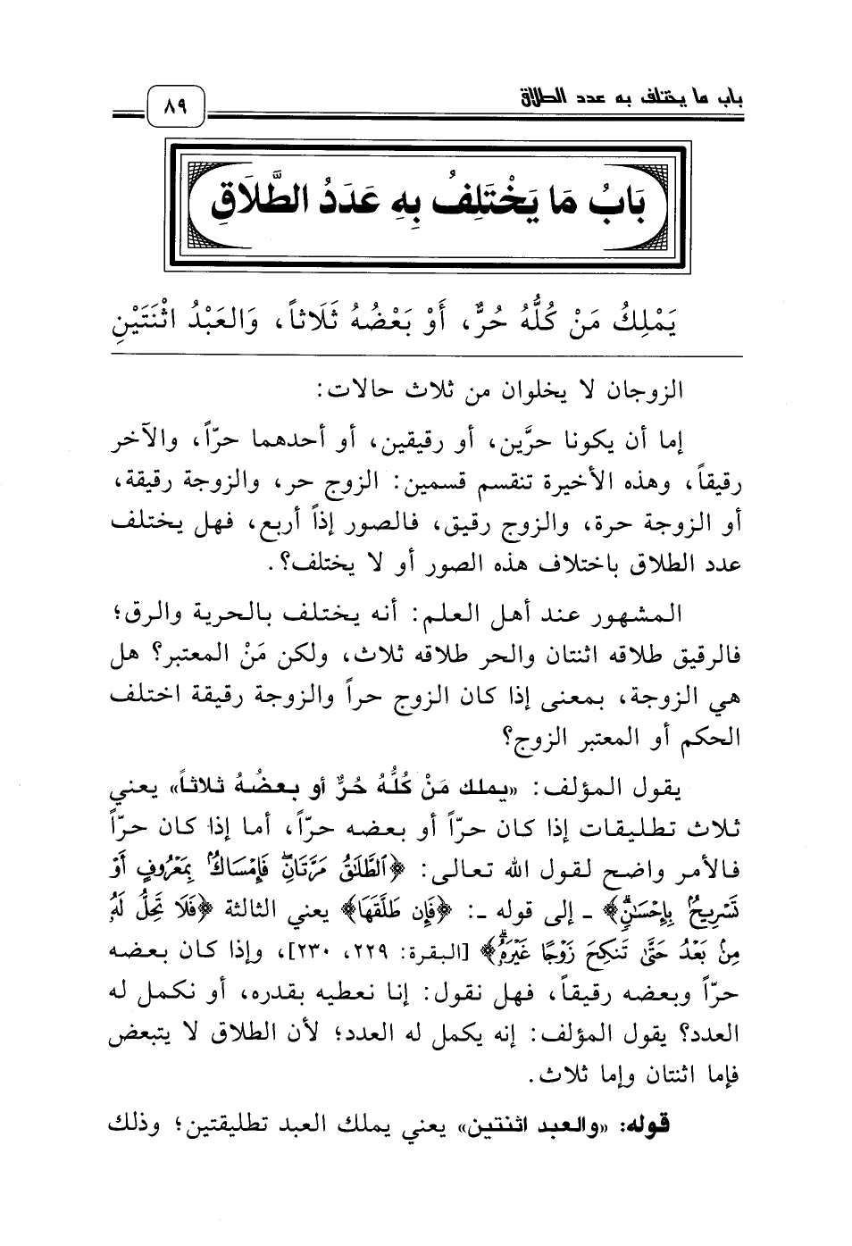 يقول المؤلف: «يملك مَنْ كُلُّهُ حُرٌّ أو بعضُهُ ثلاثاً» يعني ثلاث تطليقات إذا كان حرّاً أو بعضه حرّاً، أما إذا كان حرّاً فالأمر واضح لقول الله تعالى: {اَلطَّلاَقُ مَرَّتَانِ فَإِمْسَاكٌ بِمَعْرُوفٍ أَوْ تَسْرِيحٌ بِإِحْسَانٍ} ـ إلى قوله ـ: {فَإِنْ طَلَّقَهَا} يعني الثالثة {فَلاَ تَحِلُّ لَهُ مِنْ بَعْدُ حَتَّى تَنْكِحَ زَوْجًا غَيْرَهُ} [البقرة: 229، 230]، وإذا كان بعضه حرّاً وبعضه رقيقاً، فهل نقول: إنا نعطيه بقدره، أو نكمل له العدد؟ يقول المؤلف: إنه يكمل له العدد؛ لأن الطلاق لا يتبعض فإما اثنتان وإما ثلاث.