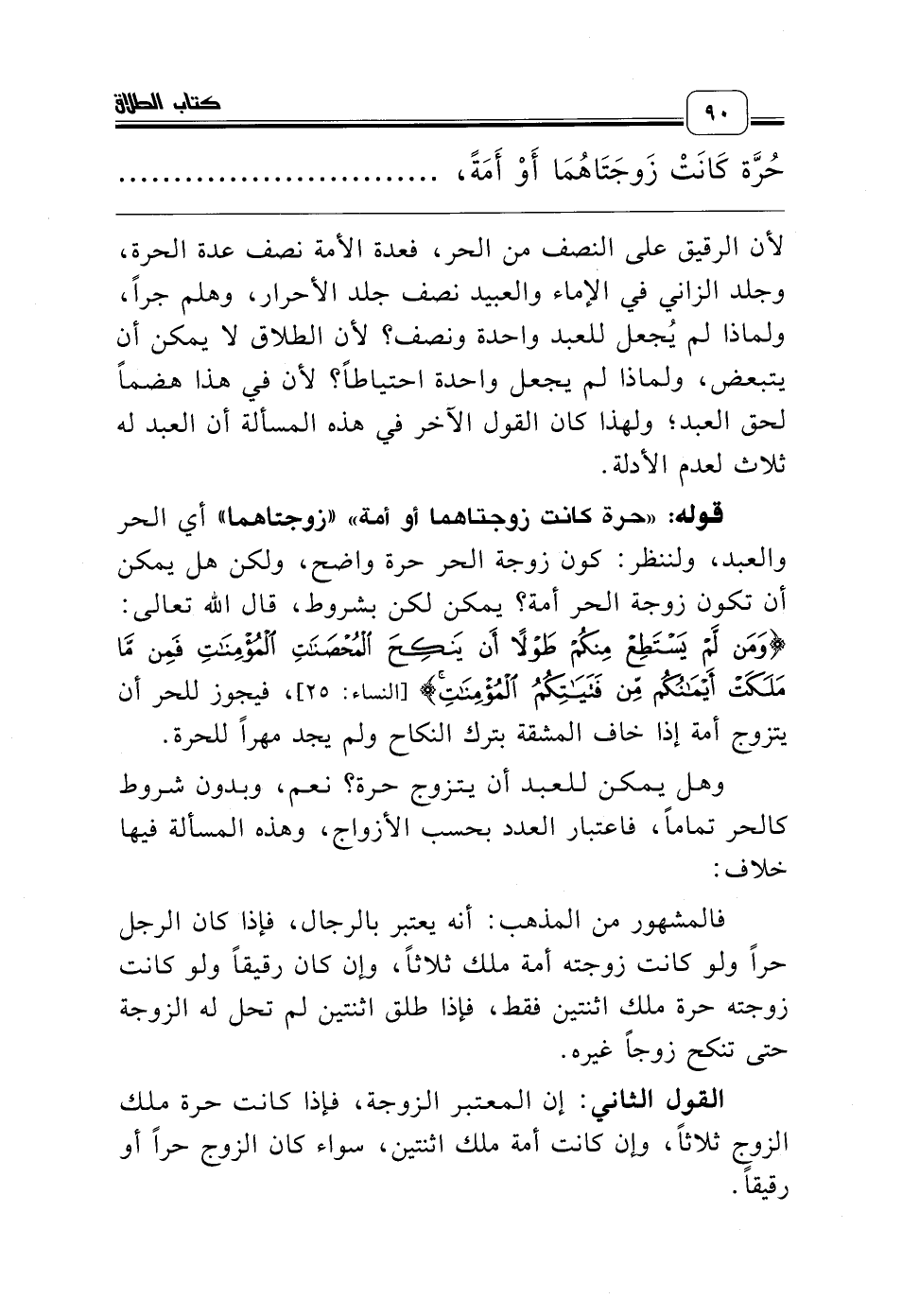 قوله: «حرة كانت زوجتاهما أو أمة» «زوجتاهما» أي الحر والعبد، ولننظر: كون زوجة الحر حرة واضح، ولكن هل يمكن أن تكون زوجة الحر أمة؟ يمكن لكن بشروط، قال الله تعالى: {وَمَنْ لَمْ يَسْتَطِعْ مِنْكُمْ طَوْلاً أَنْ يَنْكِحَ الْمُحْصَنَاتِ الْمُؤْمِنَاتِ فَمِنْ مَا مَلَكَتْ أَيْمَانُكُمْ مِنْ فَتَيَاتِكُمُ الْمُؤْمِنَاتِ} [النساء: 25]، فيجوز للحر أن يتزوج أمة إذا خاف المشقة بترك النكاح ولم يجد مهراً للحرة.