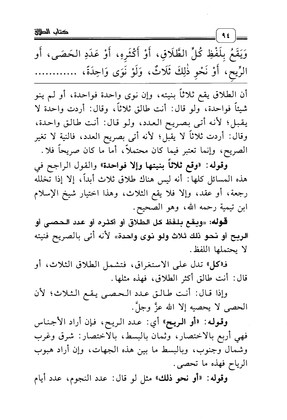 وقوله: «وقع ثلاثاً بنيتها وإلا فواحدة» والقول الراجح في هذه المسائل كلها: أنه ليس هناك طلاق ثلاث أبداً، إلا إذا تخلله رجعة، أو عقد، وإلا فلا يقع الثلاث، وهذا اختيار شيخ الإسلام ابن تيمية رحمه الله، وهو الصحيح.