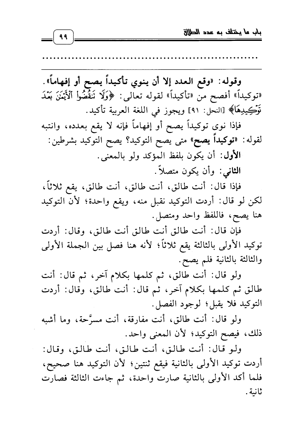 وقوله: «وقع العدد إلا أن ينوي تأكيداً يصح أو إفهاماً». «توكيداً» أفصح من «تأكيداً» لقوله تعالى: {وَلاَ تَنْقُضُوا الأَيْمَانَ بَعْدَ تَوْكِيدِهَا} [النحل: 91] ويجوز في اللغة العربية تأكيد.