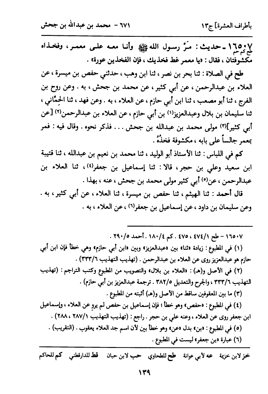 طح في الصلاة: ثنا بحر بن نصر، ثنا ابن وهب، حدثني حفص بن ميسرة، عن العلاء بن عبد الرحمن، عن أبي كثير، عن محمد بن جحش، به. وعن روح بن الفرج، ثنا أبو مصعب، ثنا ابن أبي حازم، عن العلاء، به. وعن فهد، ثنا الحِماني، ثنا سليمان بن بلال وعبد العزيز بن أبي حازم، عن العلاء بن عبد الرحمن [عن أبي كثير] مولى محمد بن عبد الله بن جحش ... فذكر نحوه. وقال فيه: فمر بمعمر جالساً على بابه، مكشوفة فخذُهُ.