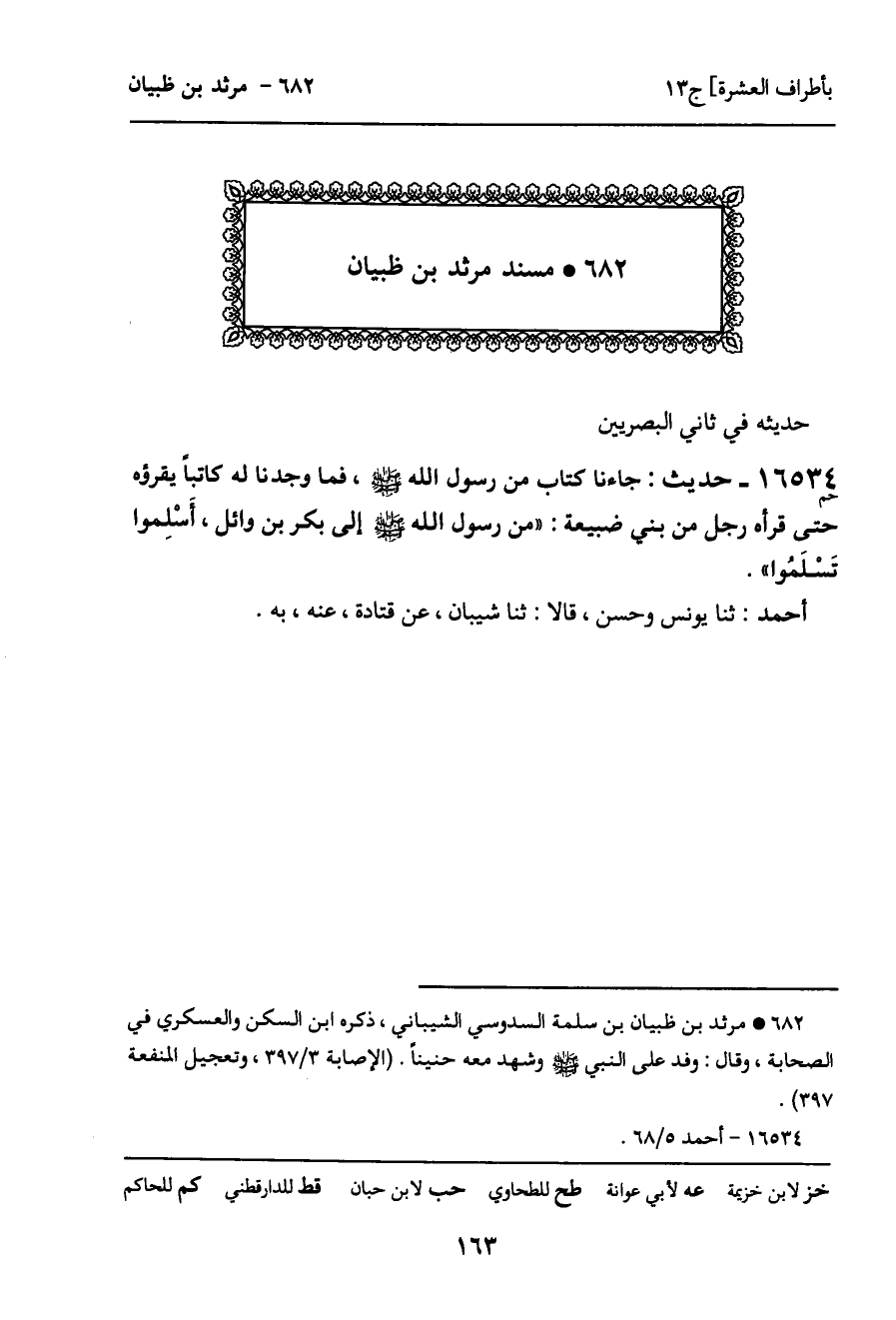 16534 - حديث (حم) : جاءنا كتاب من رسول الله - صَلَّى اللَّهُ عَلَيْهِ وَسَلَّمَ -، فما وجدنا له كاتباً يقرؤه حتى قرأه رجل من بني ضبيعة: "من رسول الله - صَلَّى اللَّهُ عَلَيْهِ وَسَلَّمَ - إلى بكر بن وائل، أَسْلِموا تَسْلَمُوا".