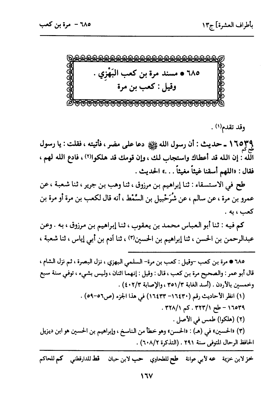 طح في الاستسقاء: ثنا إبراهيم بن مرزوق، ثنا وهب بن جرير، ثنا شعبة، عن عمرو بن مرة، عن سالم، عن شرَحْبيل بن السمْط، أنه قال لكعب بن مرة أو مرة بن كعب، به.