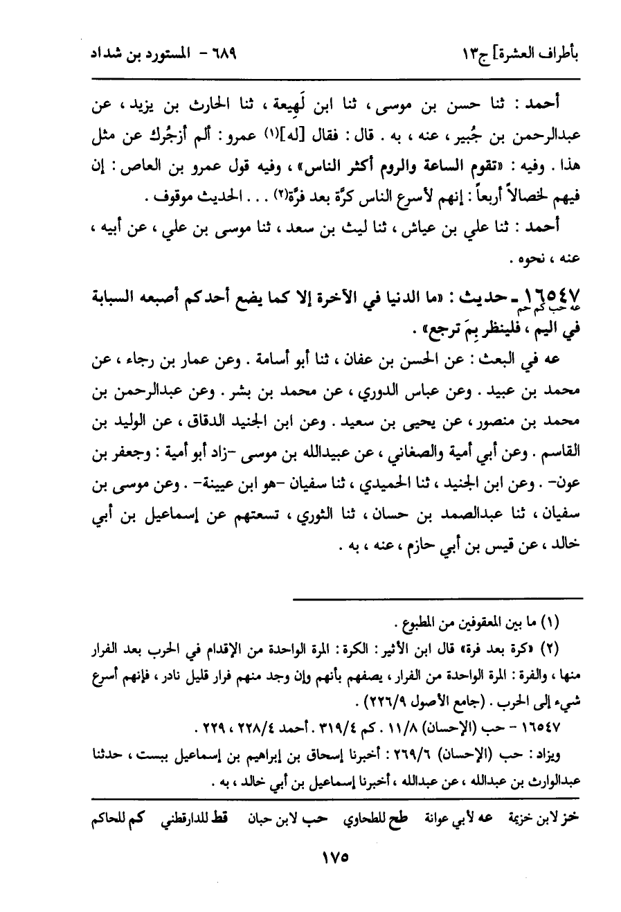 16547 - حديث (عه حب كم حم) : "ما الدنيا في الآخرة إلا كما يضع أحدكم أصبعه السبابة في اليم، فلينظر بِمَ ترجع".