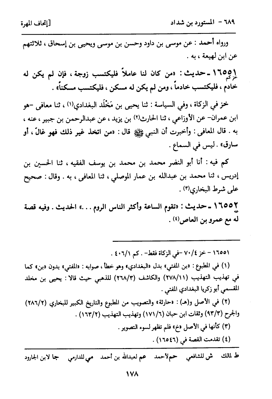 خز في الزكاة، وفي السياسة: ثنا يحيى بن مَخْلَد البغدادي، ثنا معافى - هو ابن عمران - عن الأوزاعي، ثنا الحارث بن يزيد، عن عبد الرحمن بن جبير، عنه، به. قال المعافى: وأخبرت أن النبي - صَلَّى اللَّهُ عَلَيْهِ وَسَلَّمَ - قال: "من اتخذ غير ذلك فهو غال، أو سارق". ليس في السماع.