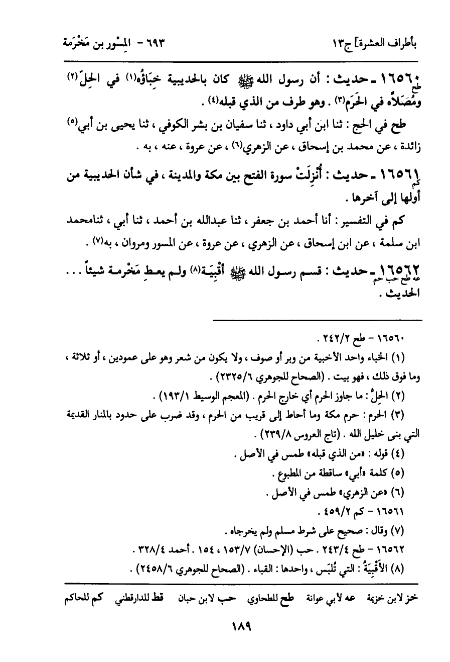 16560 - حديث (طح) : أن رسول الله - صَلَّى اللَّهُ عَلَيْهِ وَسَلَّمَ - كان بالحديبية خَباؤُه في الحلّ ومُصَلاه في الحَرَم. وهو طرف من الذي قبله.