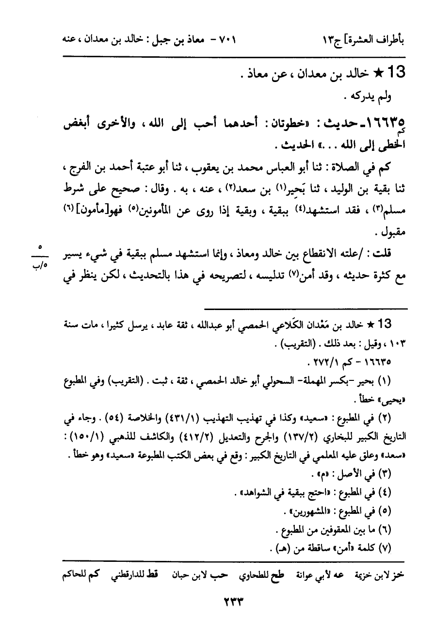 -[234]- حديث بحير عن خالد، لأن بقية كان يُسَوي، وعلى تقدير أن مسلماً يخرج لبقية في المتابعات، لا يعم جميع حديثه إلا إن توبع من جهة يُوثَق بها، وهذا الحكم غريب جدا، فكيف يكون أصلا يحتج به على شرط الصحيح؟! ومع ذلك في أحمد ابن الفرج مقال.