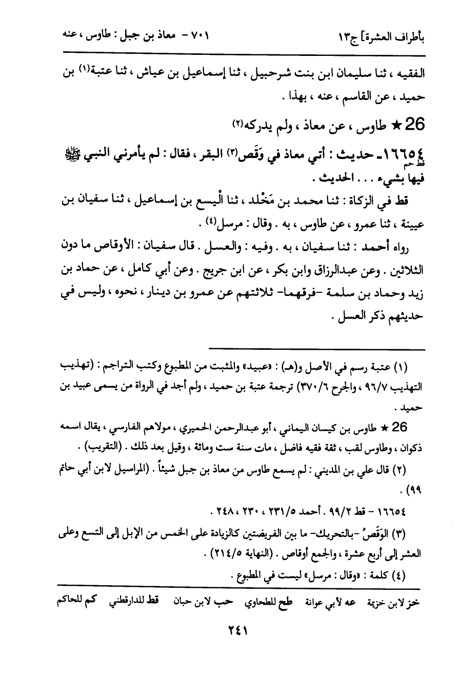 رواه أحمد: ثنا سفيان، به. وفيه: والعسل. قال سفيان: الأوقاص ما دون الثلاثين. وعن عبد الرزاق وابن بكر، عن ابن جريج. وعن أبي كامل، عن حماد بن زيد وحماد بن سلمة - فرقهما - ثلاثتهم عن عمرو بن دينار، نحوه، وليس في حديثهم ذكر العسل.