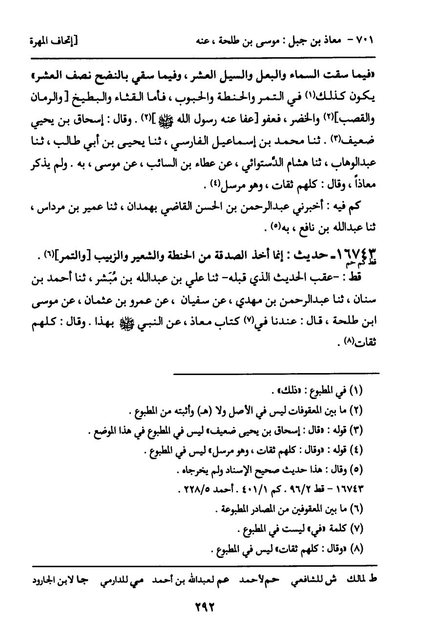 قط: - عقب الحديث الذي قبله - ثنا علي بن عبد الله بن مُبَشر، ثنا أحمد بن سنان، ثنا عبد الرحمن بن مهدي، عن سفيان، عن عمرو بن عثمان، عن موسى ابن طلحة، قال: عندنا في كتاب معاذ، عن النبي - صَلَّى اللَّهُ عَلَيْهِ وَسَلَّمَ - بهذا. وقال: كلهم ثفات.