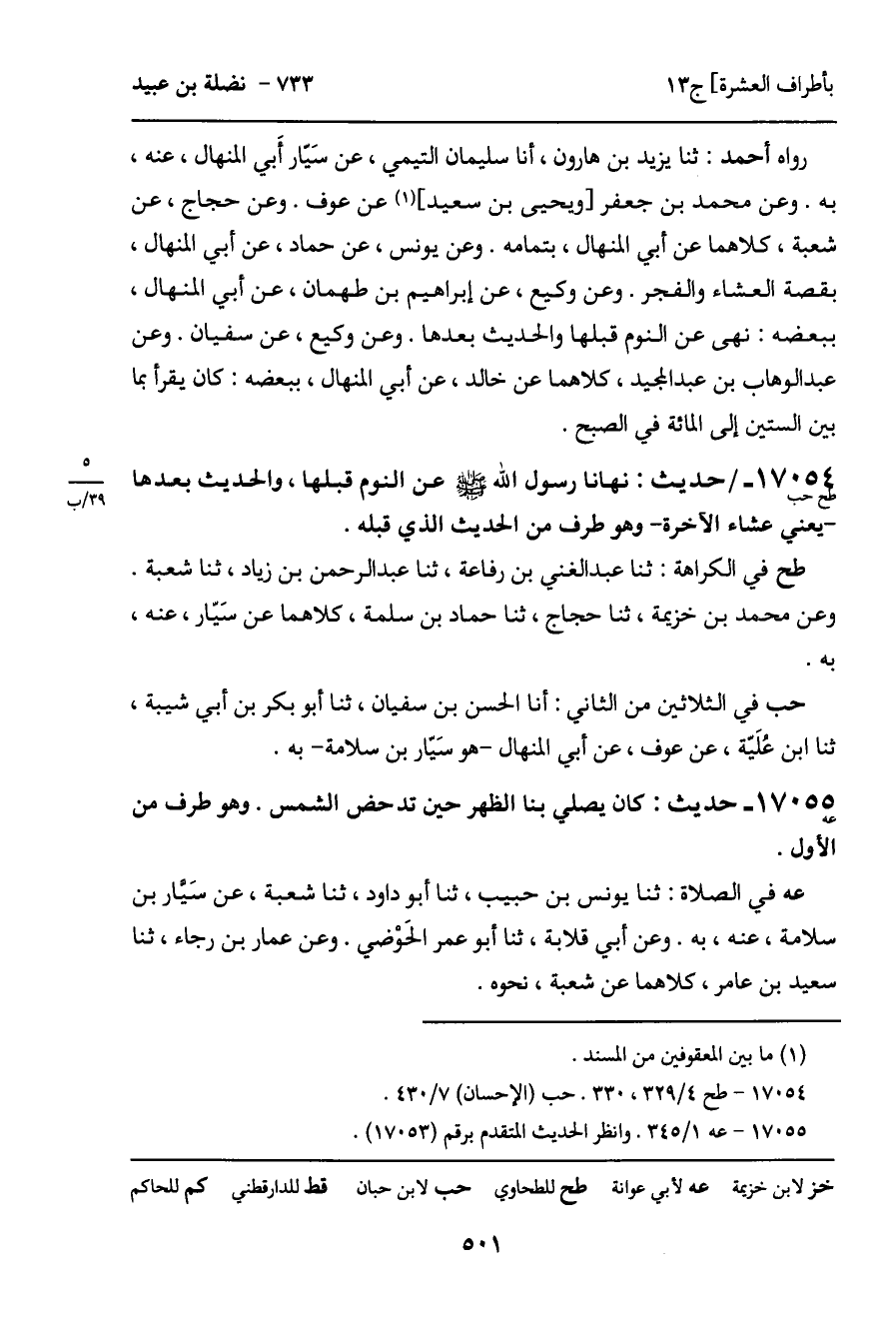 17054 - حديث (طح حب) : نهانا رسول الله - صَلَّى اللَّهُ عَلَيْهِ وَسَلَّمَ - عن النوم قبلها، والحديث بعدها - يعني عشاء الآخرة - وهو طرف من الحديث الذي قبله.
