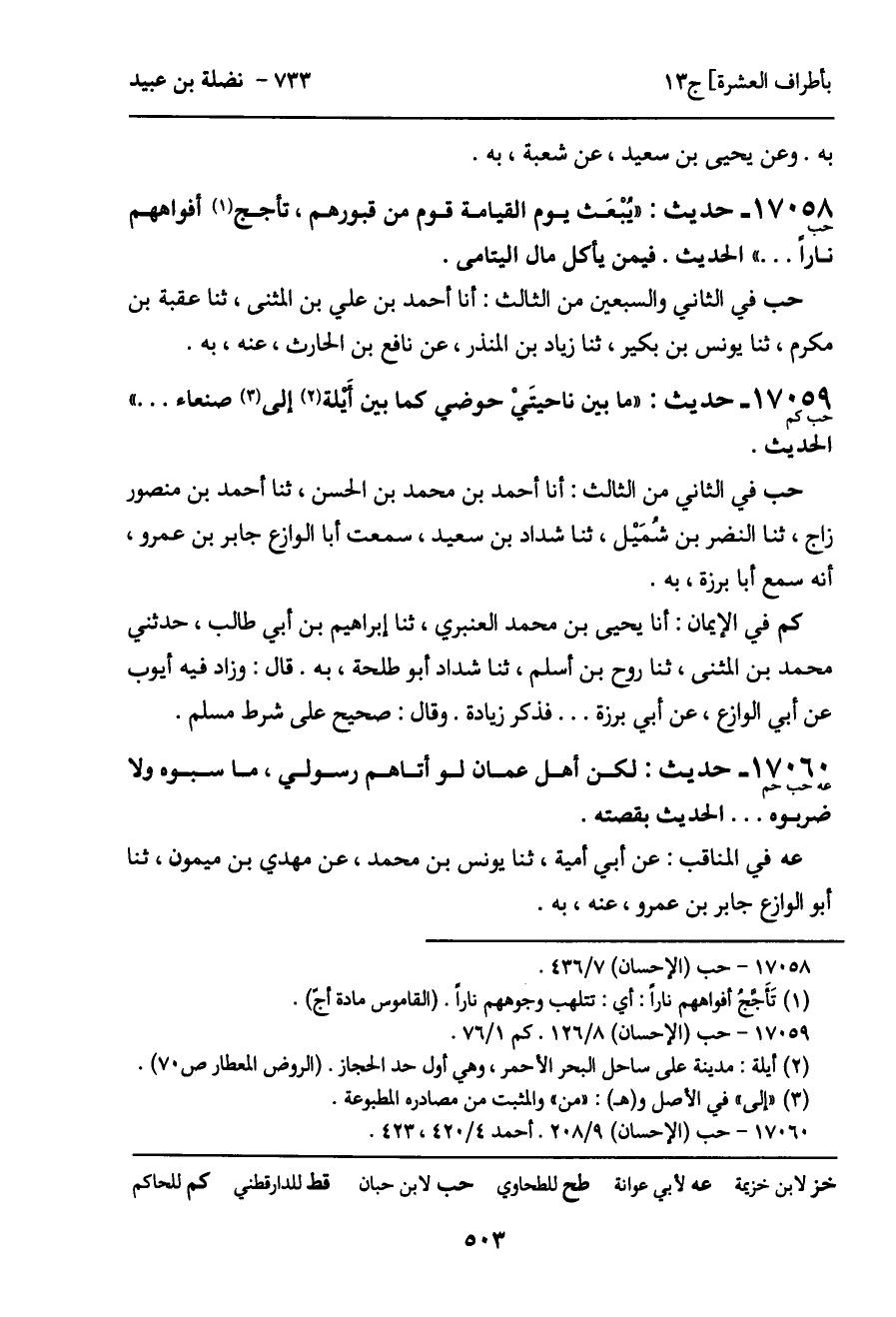 17058 - حديث (حب) : "يُبْعَث يوم القيامة قوم من قبورهم، تأجج أفواههم نارا ... " الحديث. فيمن يأكل مال اليتامى.