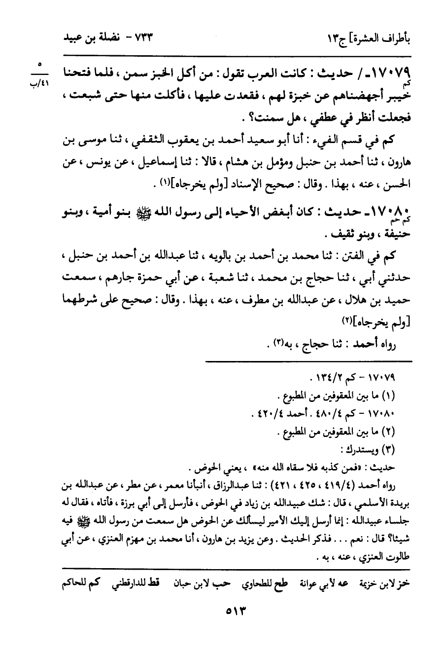 كم في الفتن: ثنا محمد بن أحمد بن بالويه، ثنا عبد الله بن أحمد بن حنبل، حدثني أبي، ثنا حجاج بن محمد، ثنا شعبة، عن أبي حمزة جارهم، سمعت حميد بن هلال، عن عبد الله بن مطرف، عنه، بهذا. وقال: صحيح على شرطهما [ولم يخرجاه]