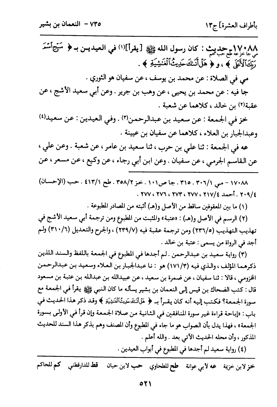 رواه أحمد: ثنا سفيان، عن إبراهيم بن محمد بن المنتشر، عن أبيه، عن حبيب ابن سالم، عن أبيه، عن النعمان، به. كذا قال. وفيه: وإن وافق يوم الجمعة قرأهما. - قال عبد الله بن أحمد: حبيب بن سالم سمعه من النعمان، وكان كاتبه. وسفيانُ يخطئ فيه حيث يقول: عن أبيه، وهو سمعه من النعمان - وعن يحيى بن سعيد ومحمد بن جعفر وهاشم، ثلاثتهم عن شعبة. وعن عفان، عن أبي عوانة. وعن وكيع، عن مسعر. وعن عبد الرزاق، عن سفيان، كلهم عن إبراهيم بن محمد بن المنتشر، عن أبيه، عن حبيب بن سالم، عن النعمان، به. وعن عبد الرحمن بن مهدي، عن مالك، عن ضمرة بن سعيد، عن عبيد الله بن عبد الله بن عتبة، أن الضحاك بن قيس سأل النعمان، نحوه.