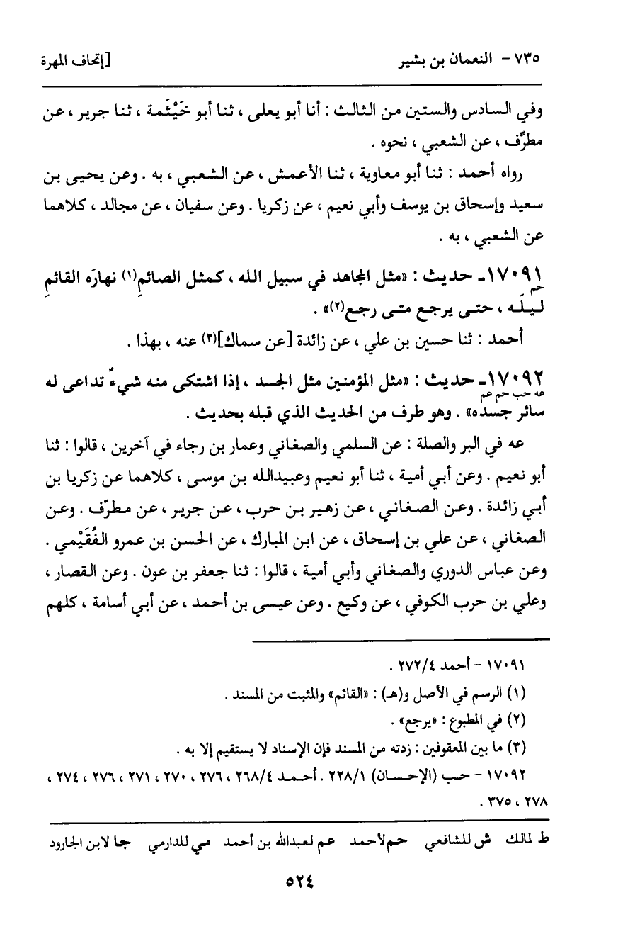 17092 - حديث (عه حب حم عم) : "مثل المؤمنين مثل الجسد، إذا اشتكى منه شيء: تداعى له سائر جسده". وهو طرف من الحديث الذي قبله بحديث.