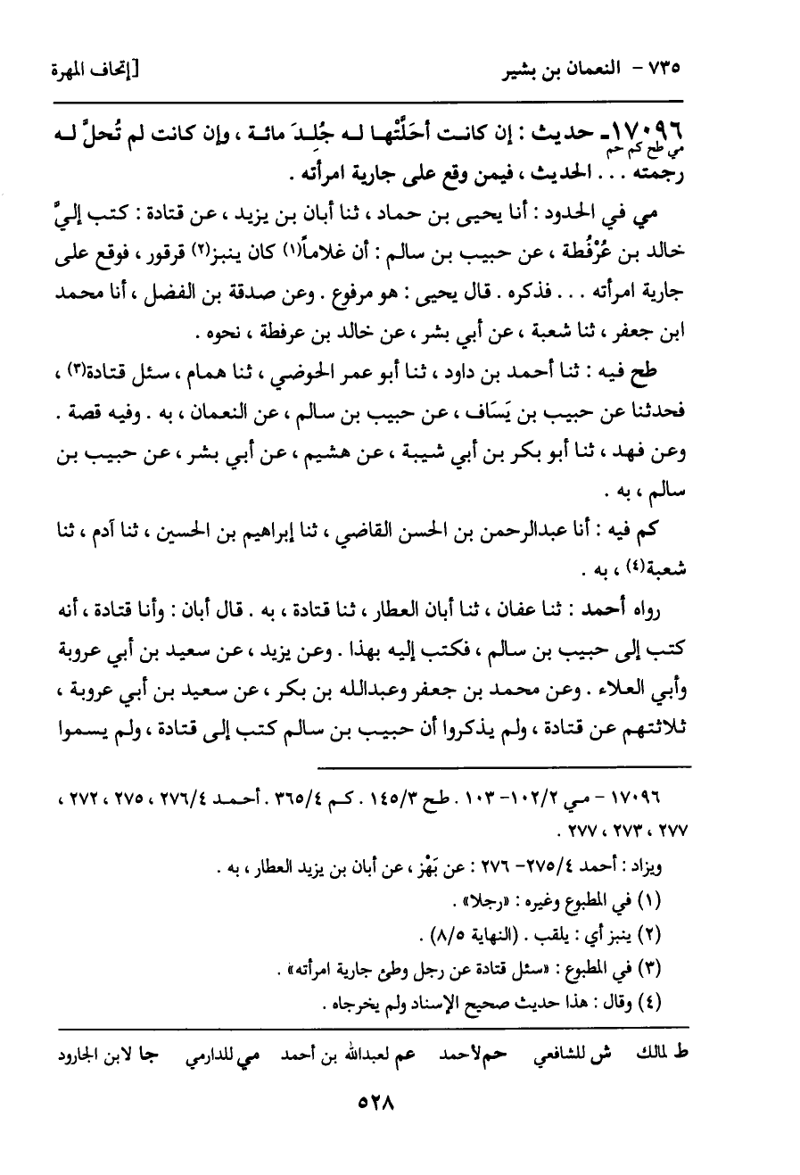 مي في الحدود: أنا يحيى بن حماد، ثنا أبان بن يزيد، عن قتادة: كتب إليَّ خالد بن عرْفُطة، عن حبيب بن سالم: أن غلاما كان ينبز قرقور، فوقع على جارية امرأته ... فذكره. قال يحيى: هو مرفوع. وعن صدقة بن الفضل، أنا محمد ابن جعفر، ثنا شعبة، عن أبي بشر، عن خالد بن عرفطة، نحوه.