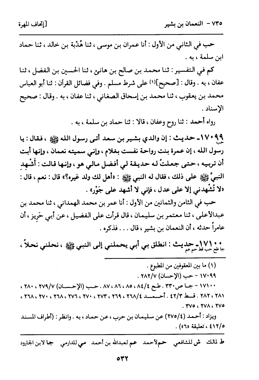 17099 - حديث (حب) : إن والدي بشير بن سعد أتى رسول الله - صَلَّى اللَّهُ عَلَيْهِ وَسَلَّمَ -، فقال: يا رسول الله، إن عمرة بنت رواحة نفست بغلام، وإني سميته نعمان، وإنها أبت أن تربيه، حتى جعلتُ له حديقة لي أفضل مالي هو، وإنها قالت: أَشْهِدِ النبي - صَلَّى اللَّهُ عَلَيْهِ وَسَلَّمَ - على ذلك، فقال له النبي - صَلَّى اللَّهُ عَلَيْهِ وَسَلَّمَ -: "أهل لك ولد غيره؟ " قال: نعم، قال: "لاتُشهدني إلا على عدل، فإني لا أشهد على جَوْر".