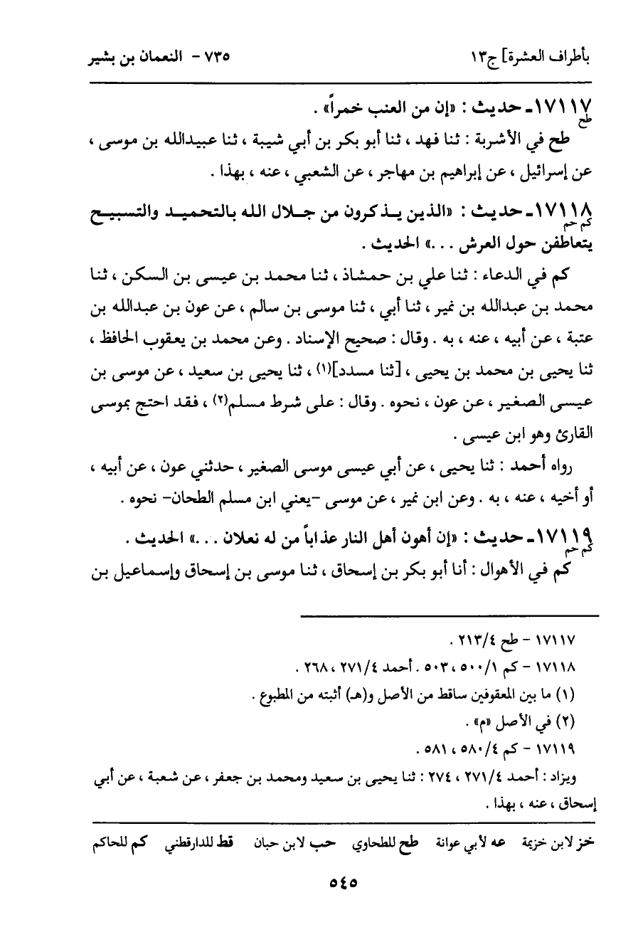 -[546]- قتيبة، قالا: ثنا أبو بكر بن أبي شيبة، ثنا أبو أسامة، عن الأعمش، ثنا أبو إسحاق، عن النعمان، به. قال الأعمش: وسمعت خيثمة يذكره أيضاً، عن النعمان. وحدثني أبو بكر [محمد بن أحمد] بن بالويه، ثنا عبد الله بن أحمد ابن حنبل، حدثني أبي، ثنا محمد، ثنا شعبة، سمعت أبا إسحاق، سمعت النعمان، به. وعن ابن بالويه، ثنا محمد بن إسحاق بن خزيمة، ثنا محمد بن بشار، ثنا محمد بن جعفر، به. وعن المحبوبي، ثنا سعيد بن مسعود، ثنا عبيد الله بن موسى، أنا إسرائيل، عن أبي إسحاق، نحوه.