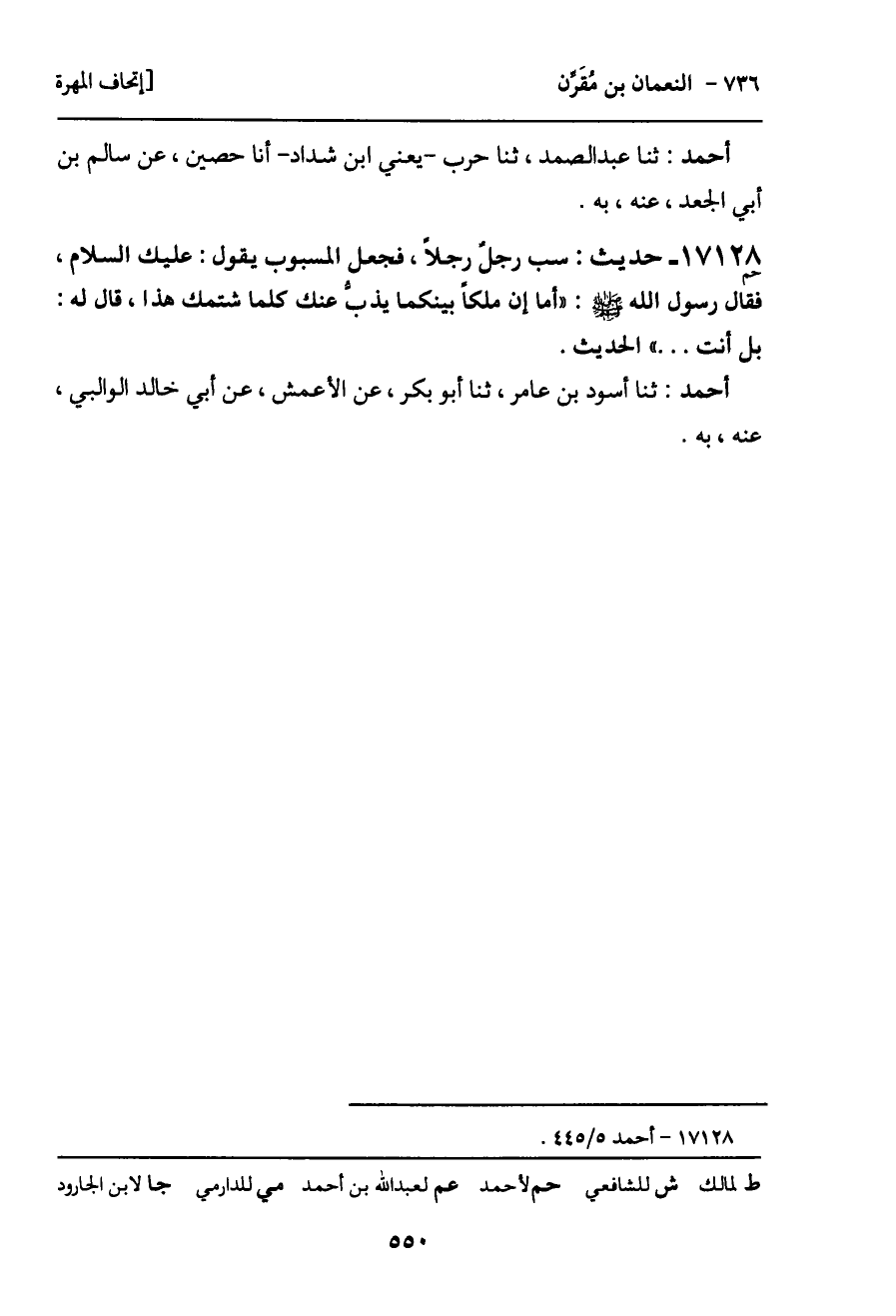 17128 - حديث (حم) : سب رجل رجلاً، فجعل المسبوب يقول: عليك السلام، فقال رسول الله - صَلَّى اللَّهُ عَلَيْهِ وَسَلَّمَ -: "أما إن ملكا بينكما يذب عنك كلما شتمك هذا، قال له: بل أنت ... " الحديث.