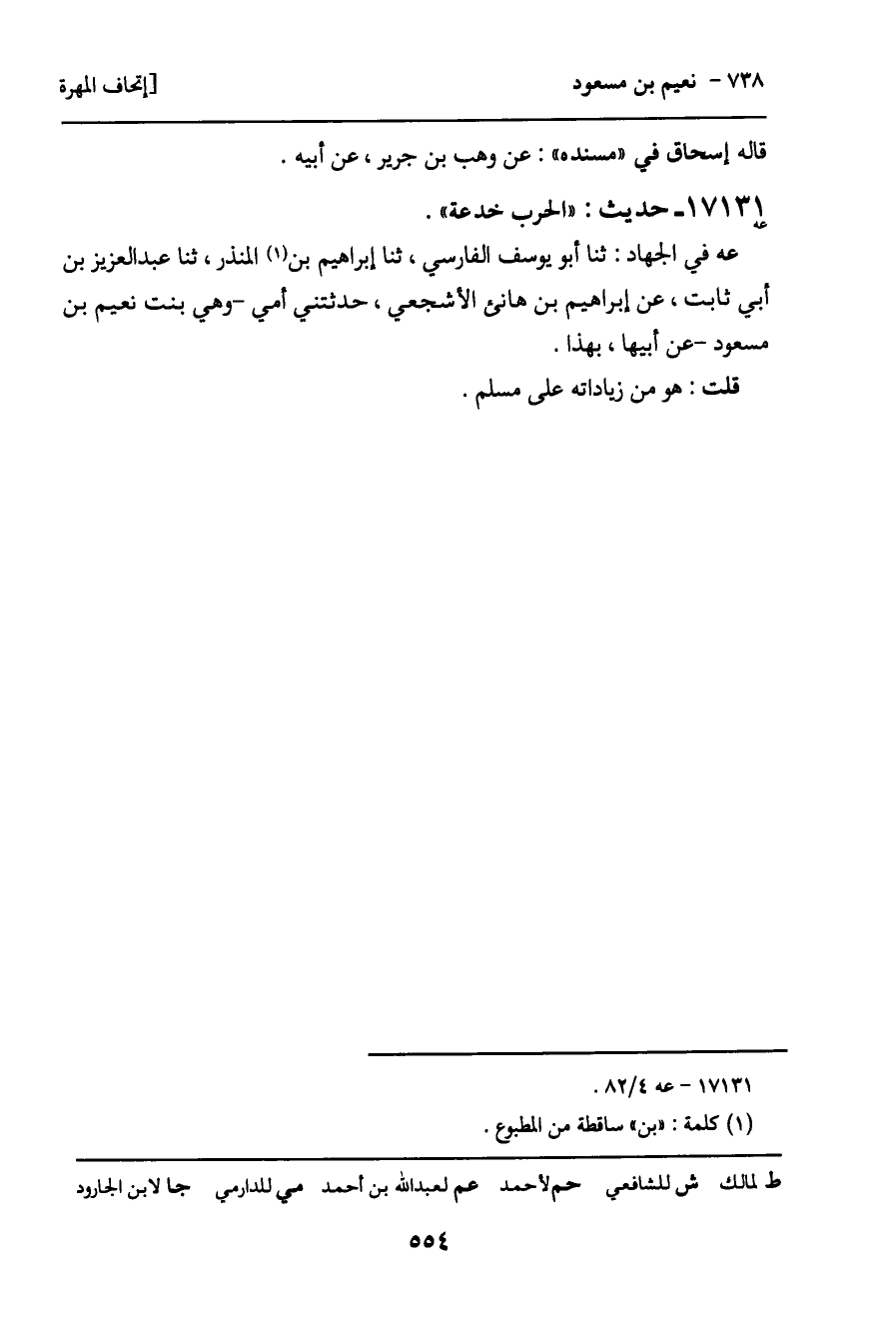 عه في الجهاد: ثنا أبو يوسف الفارسي، ثنا إبراهيم بن المنذر، ثنا عبد العزيز بن أبي ثابت، عن إبراهيم بن هانئ الأشجعي، حدثتني أمي - وهي بنت نعيم بن مسعود - عن أبيها، بهذا.
