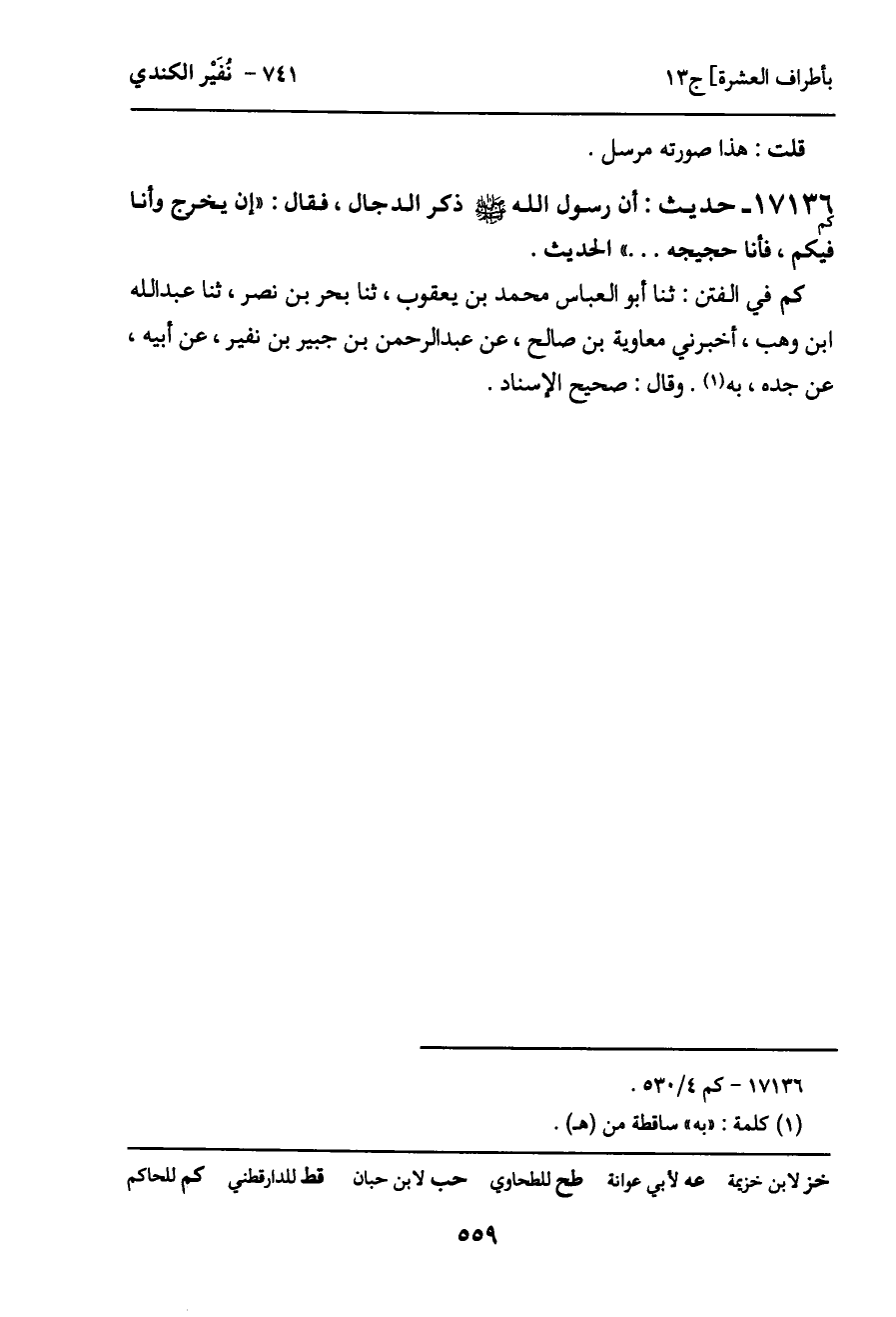 كم في الفتن: ثنا أبو العباس محمد بن يعقوب، ثنا بحر بن نصر، ثنا عبد الله ابن وهب، أخبرني معاوية بن صالح، عن عبد الرحمن بن جبير بن نفير، عن أبيه، عن جده، به. وقال: صحيح الإسناد.