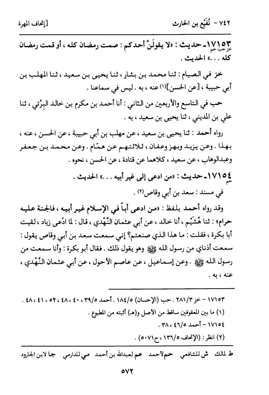وقد رواه أحمد بلفظ: "من ادعى أباً في الإسلام غير أبيه، فالجنة عليه حرام": ثنا هشَيْم، أنا خالد، عن أبي عثمان النهْدي، قال: لما ادعى زياد، لقيت أبا بكرة، فقلت: ما هذا الذي صنعتم؟ إني سمعت سعد بن أبي وقاص يقول: سمعت أذناي من رسول الله - صَلَّى اللَّهُ عَلَيْهِ وَسَلَّمَ - وهو يقول ذلك. فقال أبو بكرة: وأنا سمعت من رسول الله - صَلَّى اللَّهُ عَلَيْهِ وَسَلَّمَ -. وعن إسماعيل، عن عاصم الأحول، عن أبي عثمان النهْدي، عنه، به.