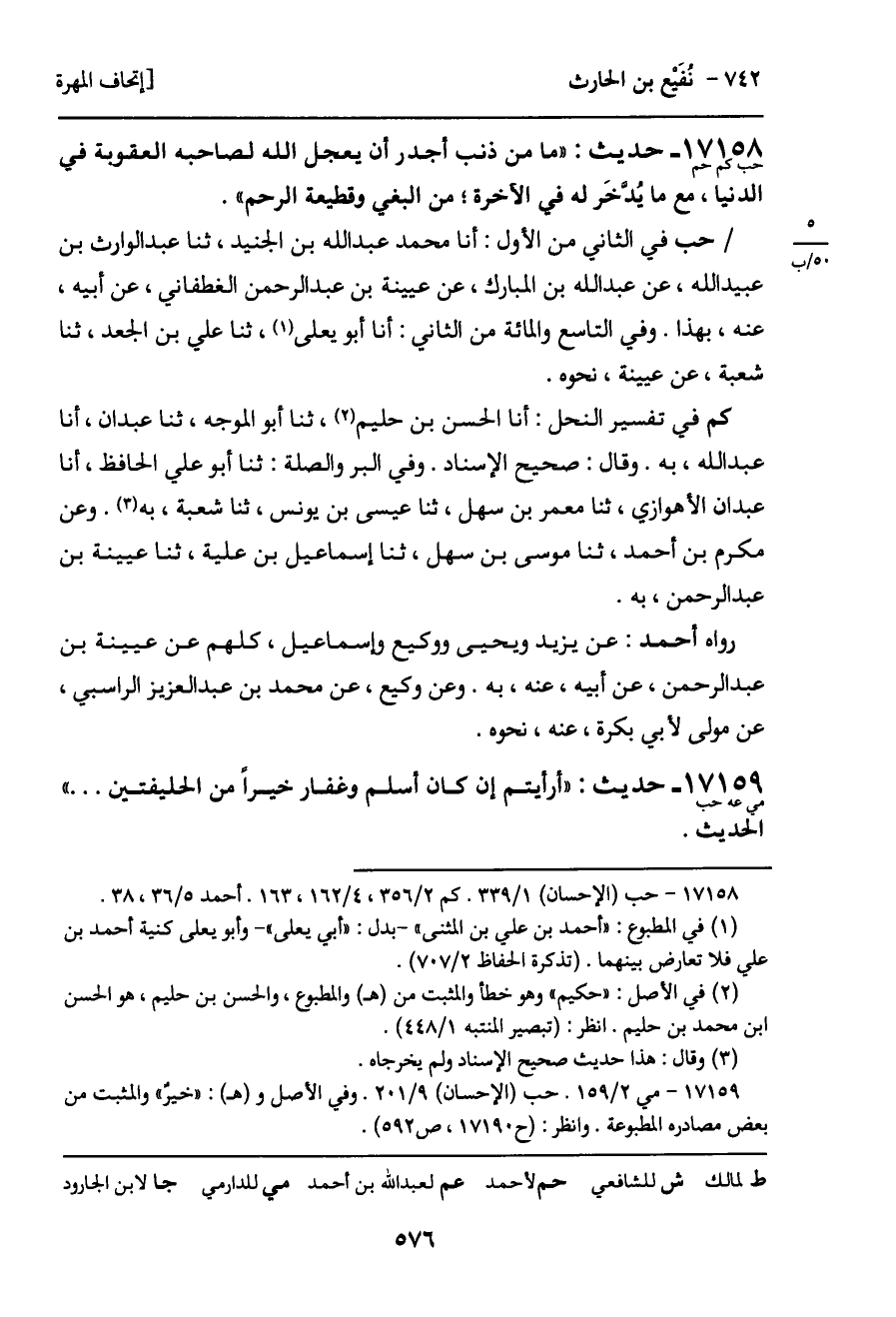 عه في المناقب: عن يونس بن حبيب، ثنا أبو داود. وعن أبي قلابة، ثنا عبد الصمد بن عبد الوارث. وعن عباس الدوري، عن شبابة. وعن إبراهيم بن مرزوق وابن المنادي، قالا: ثنا وهب بن جرير، كلهم عن شعبة، عن أبي بشر - زاد وهب وأبو داود: عن شعبة ومحمد بن عبد الله بن أبي يعقوب - كلاهما عن عبد الرحمن ابن أبي بكرة، عن أبيه. وعن الصغاني، ثنا أبو بكر بن أبي شيبة، ثنا غندر، ثنا شعبة، عن محمد بن أبي يعقوب، نحوه. وزاد في أوله: أن الأقرع بن حابس جاء إلى النبي - صَلَّى اللَّهُ عَلَيْهِ وَسَلَّمَ -، فقال: إنما بايعك سراق الحجيج ... الحديث. وعن الغَزي، ثنا الفريابي. وعن السري بن يحيى والصغاني، قالا: ثنا قَبيصة. وعن أبي أمية، ثنا عبيد الله بن موسى، كلهم عن سفيان، عن عبد الملك بن عمير، عن عبد الرحمن بن أبي بكرة، نحو حديث أبي بشر.
