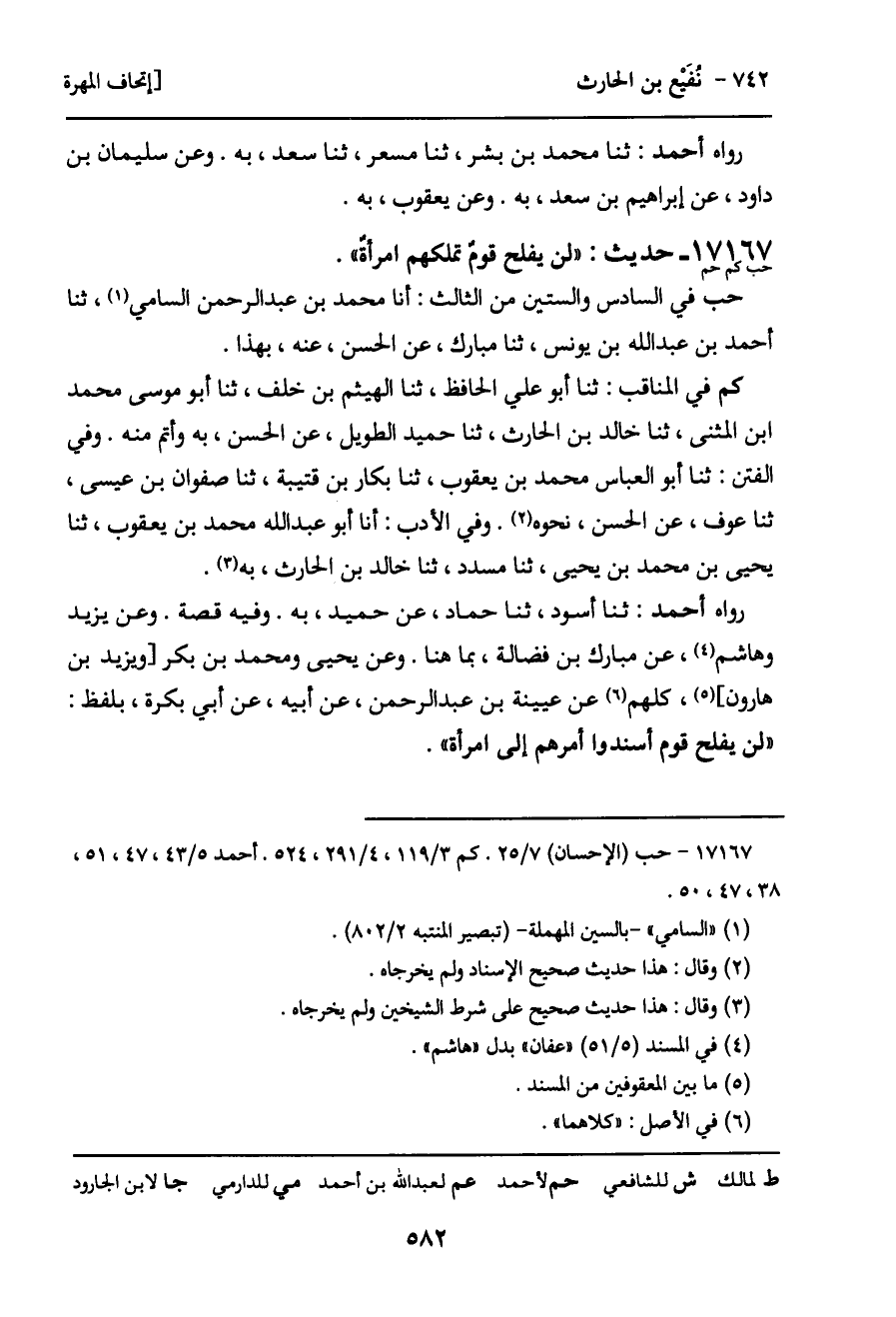 رواه أحمد: ثنا أسود، ثنا حماد، عن حميد، به. وفيه قصة. وعن يزيد وهاشم، عن مبارك بن فضالة، بما هنا. وعن يحيى ومحمد بن بكر [ويزيد بن هارون] ، كلهم عن عيينة بن عبد الرحمن، عن أبيه، عن أبي بكرة، بلفظ: "لن يفلح قوم أسندوا أمرهم إلى امرأة".