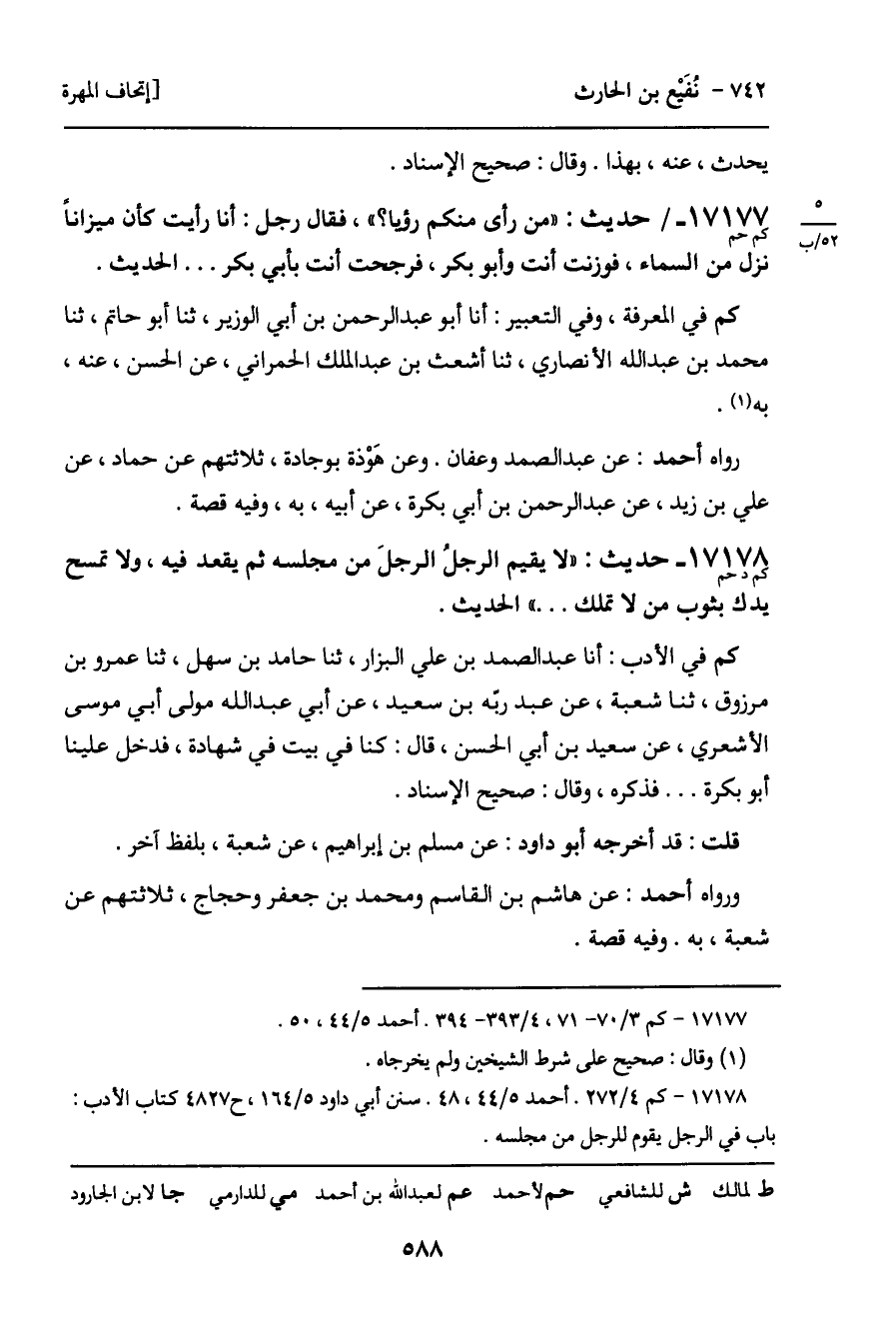 رواه أحمد: عن عبد الصمد وعفان. وعن هَوْذة بوجادة، ثلاثتهم عن حماد، عن علي بن زيد، عن عبد الرحمن بن أبي بكرة، عن أبيه، به، وفيه قصة.