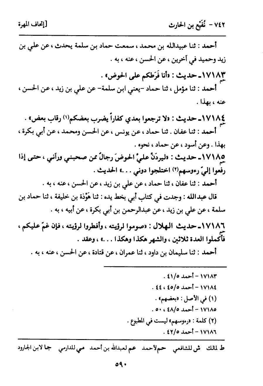 أحمد: ثنا عفان. ثنا حماد، عن يونس، عن الحسن ومحمد، عن أبي بكرة، بهذا. وعن أسود، عن حماد، نحوه.