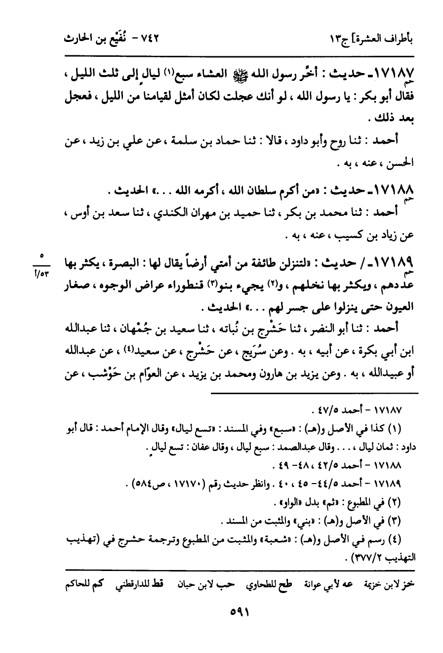 17189 - حديث (حم) : "لتنزلن طائفة من أمتي أرضاً يقال لها: البصرة، يكثر بها عددهم، ويكثر بها نخلهم، ويجيء بنو قنطوراء عراض الوجوه، صغار العيون حتى ينزلوا على جسر لهم ... " الحديث.