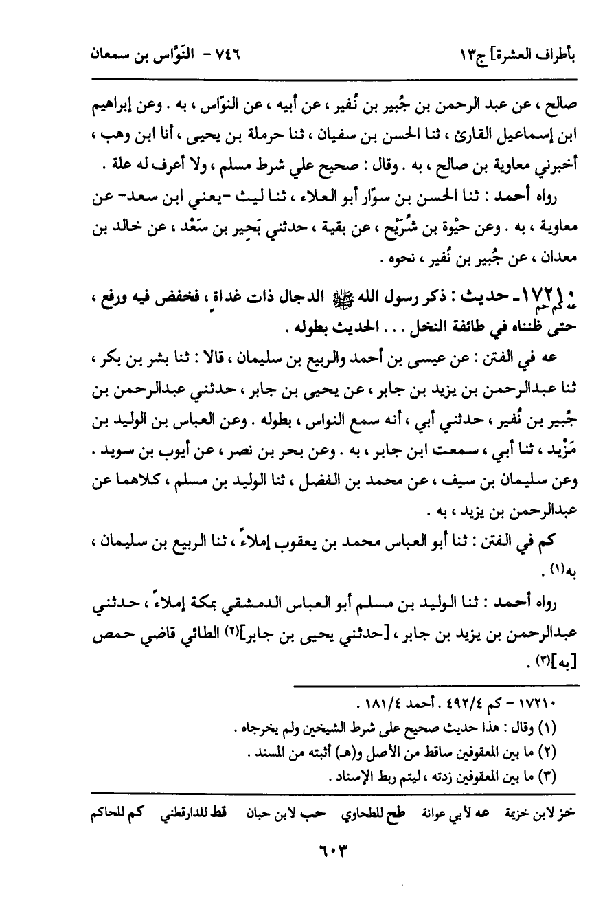 عه في الفتن: عن عيسى بن أحمد والربيع بن سليمان، قالا: ثنا بشر بن بكر، ثنا عبد الرحمن بن يزيد بن جابر، عن يحيى بن جابر، حدثني عبد الرحمن بن جُبير بن نُفير، حدثني أبي، أنه سمع النواس، بطوله. وعن العباس بن الوليد بن مَزيد، ثنا أبي، سمعت ابن جابر، به. وعن بحر بن نصر، عن أيوب بن سويد.
