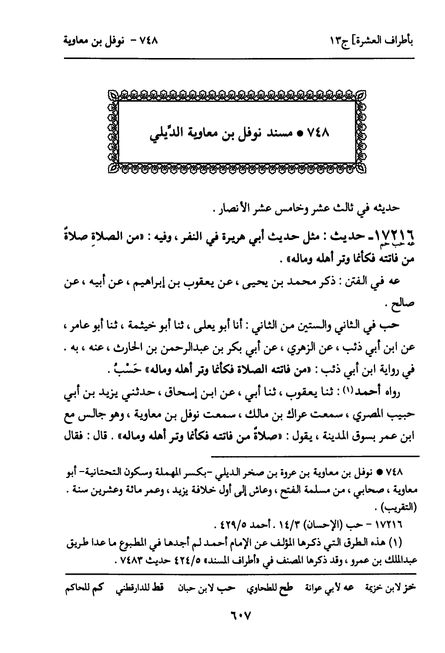 17216 - حديث (عه حب حم) : مثل حديث أبي هريرة في النفر، وفيه: "من الصلاة صلاة من فاتته فكأنما وتر أهله وماله".