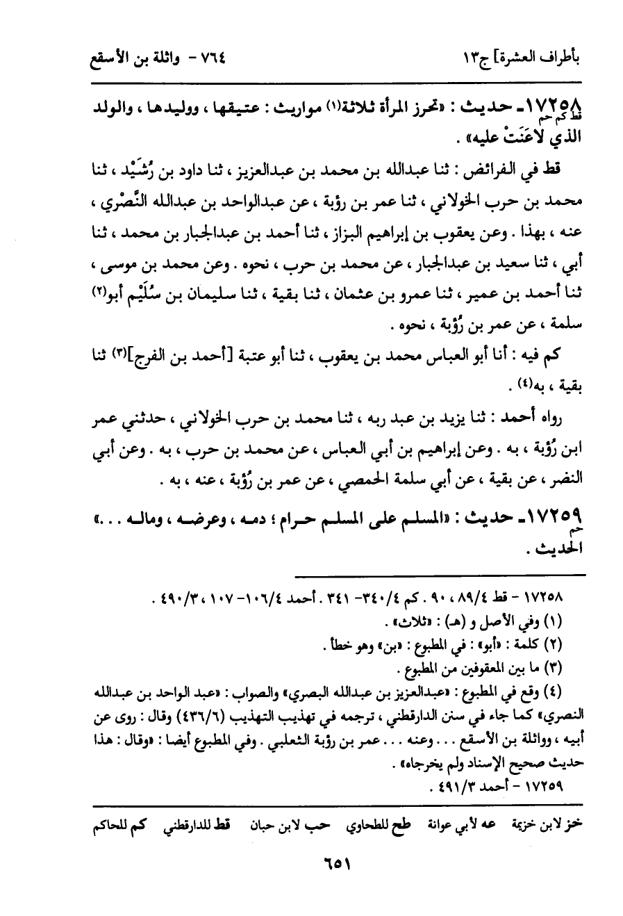 قط في الفرائض: ثنا عبد الله بن محمد بن عبد العزيز، ثنا داود بن رُشَيْد، ثنا محمد بن حرب الخولاني، ثنا عمر بن رؤبة، عن عبد الواحد بن عبد الله النصْري، عنه، بهذا. وعن يعقوب بن إبراهيم البزاز، ثنا أحمد بن عبد الجبار بن محمد، ثنا أبي، ثنا سعيد بن عبد الجبار، عن محمد بن حرب، نحوه. وعن محمد بن موسى، ثنا أحمد بن عمير، ثنا عمرو بن عثمان، ثنا بقية، ثنا سليمان بن سُلَيْم أبو سلمة، عن عمر بن رؤبة، نحوه.