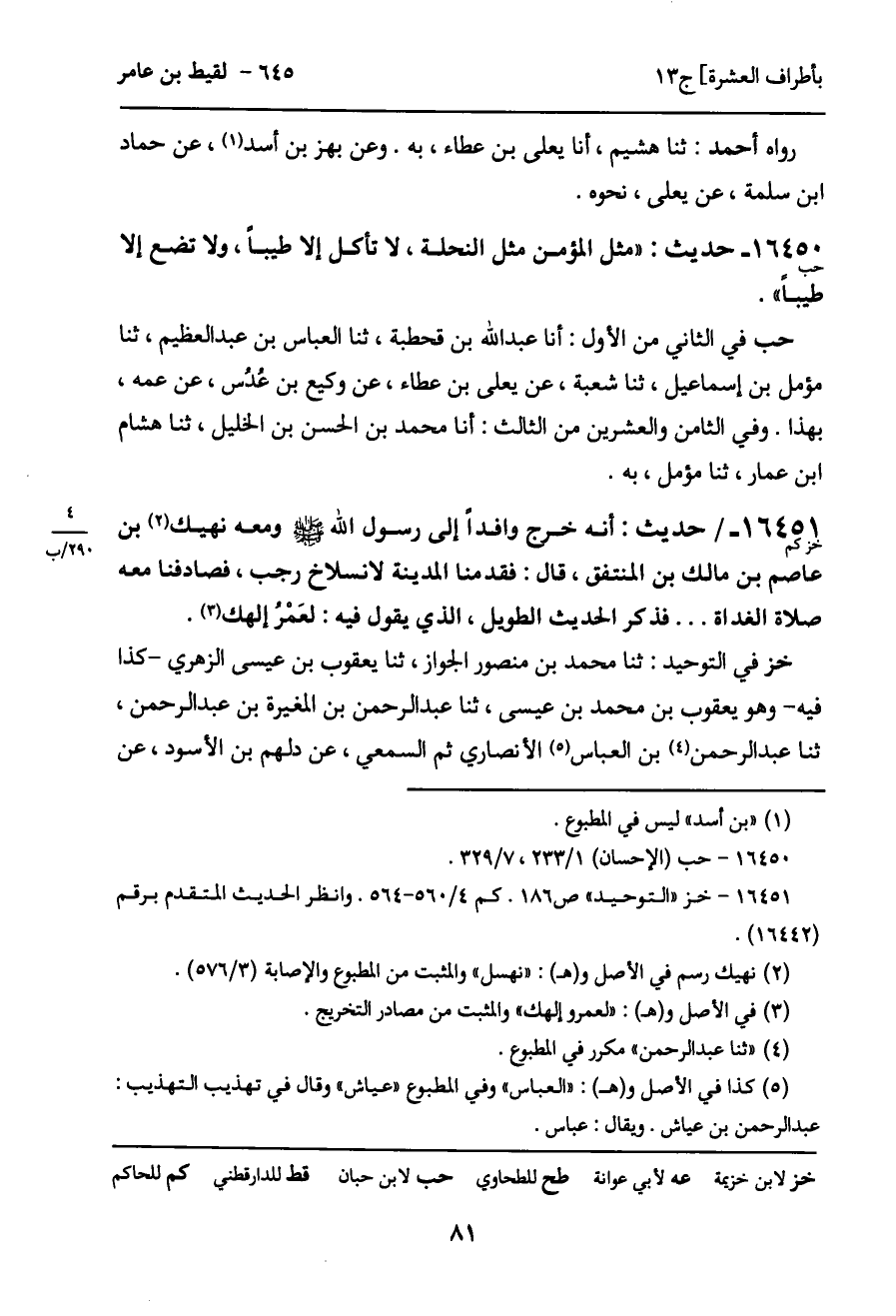 حب في الثاني من الأول: أنا عبد الله بن قحطبة، ثنا العباس بن عبد العظيم، ثنا مؤمل بن إسماعيل، ثنا شعبة، عن يعلى بن عطاء، عن وكيع بن عُدُس، عن عمه، بهذا. وفي الثامن والعشرين من الثالث: أنا محمد بن الحسن بن الخليل، ثنا هشام ابن عمار، ثنا مؤمل، به.