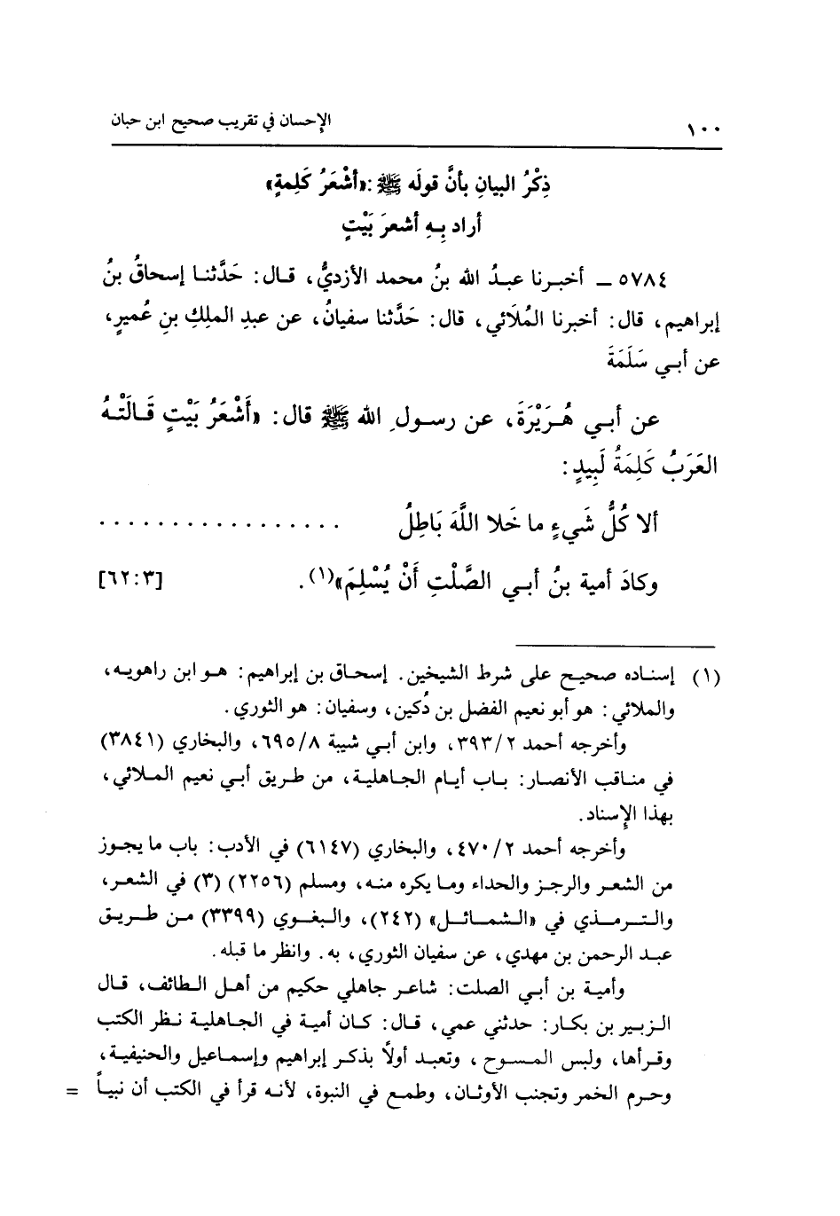ذِكْرُ الْبَيَانِ بِأَنَّ قَوْلَهُ صَلَّى اللَّهُ عَلَيْهِ وَسَلَّمَ "أَشْعَرُ كَلِمَةٍ" أَرَادَ بِهِ أَشْعَرَ بَيْتٍ