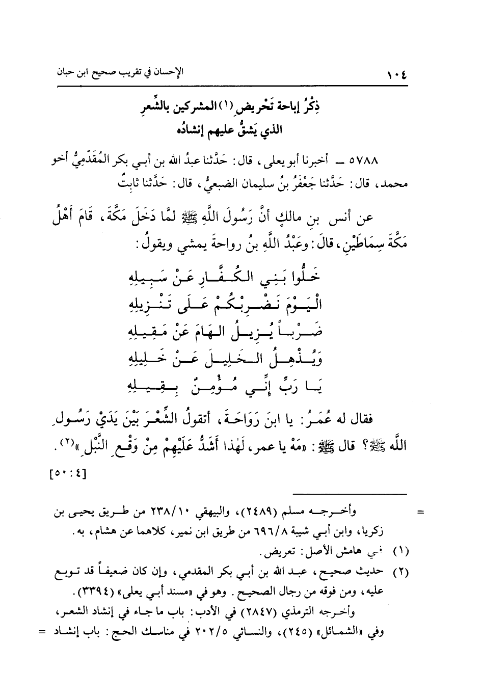 فَقَالَ لَهُ عمر: يا بن رَوَاحَةَ، أَتَقُولُ الشِّعْرَ بَيْنَ يَدَيْ رَسُولِ اللَّهِ صَلَّى اللَّهُ عَلَيْهِ وَسَلَّمَ؟ قَالَ صَلَّى اللَّهُ عَلَيْهِ وَسَلَّمَ: "مَهْ يَا عُمَرُ، لَهَذَا أَشَدُّ عليهم من وقع النبل" 2 [50:4]