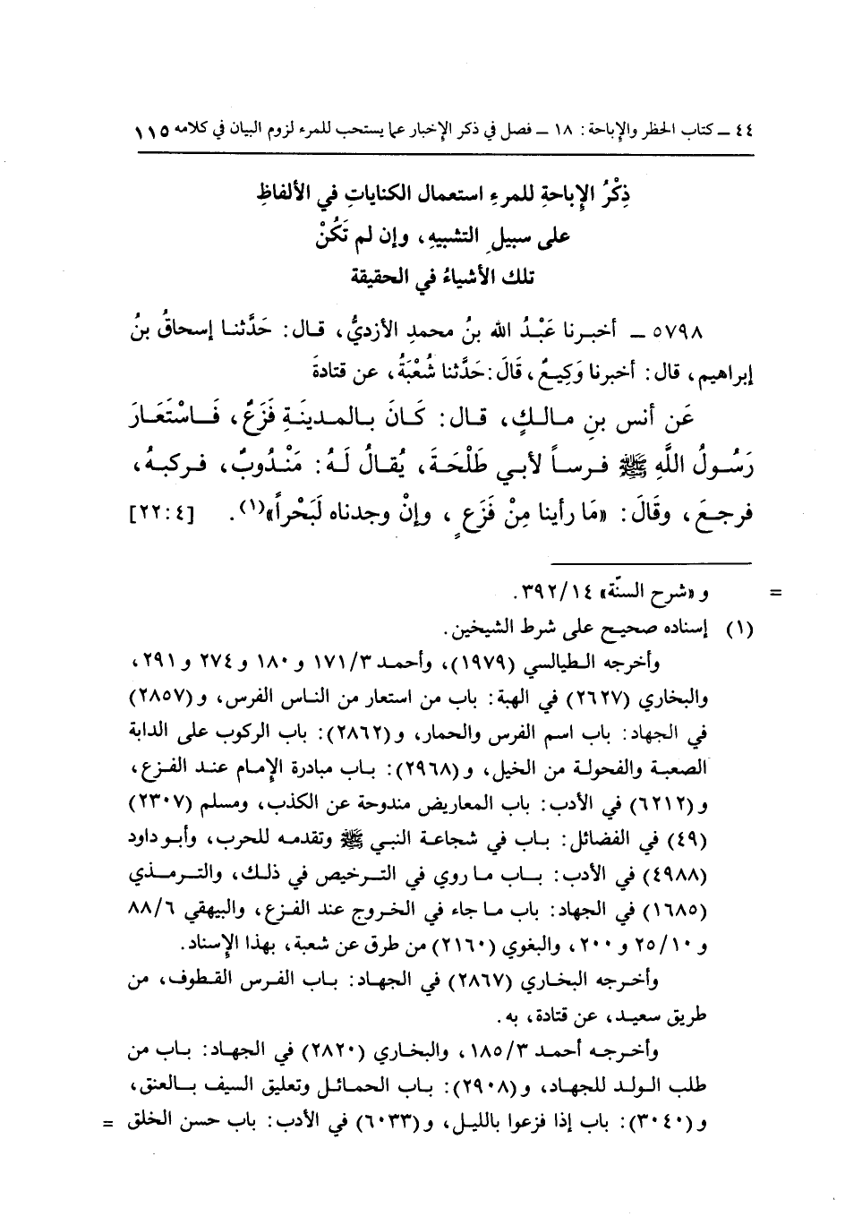 عَنْ أَنَسِ بْنِ مَالِكٍ، قَالَ: كان بِالْمَدِينَةِ فَزَعٌ فَاسْتَعَارَ رَسُولُ اللَّهِ صَلَّى اللَّهُ عَلَيْهِ وَسَلَّمَ فَرَسًا لِأَبِي طَلْحَةَ، يُقَالُ لَهُ: مَنْدُوبٌ، فَرَكِبَهُ، فَرَجَعَ، وَقَالَ: "مَا رَأَيْنَا مِنْ فزع، وان وجدناه لبحرا" 1 [22:4]