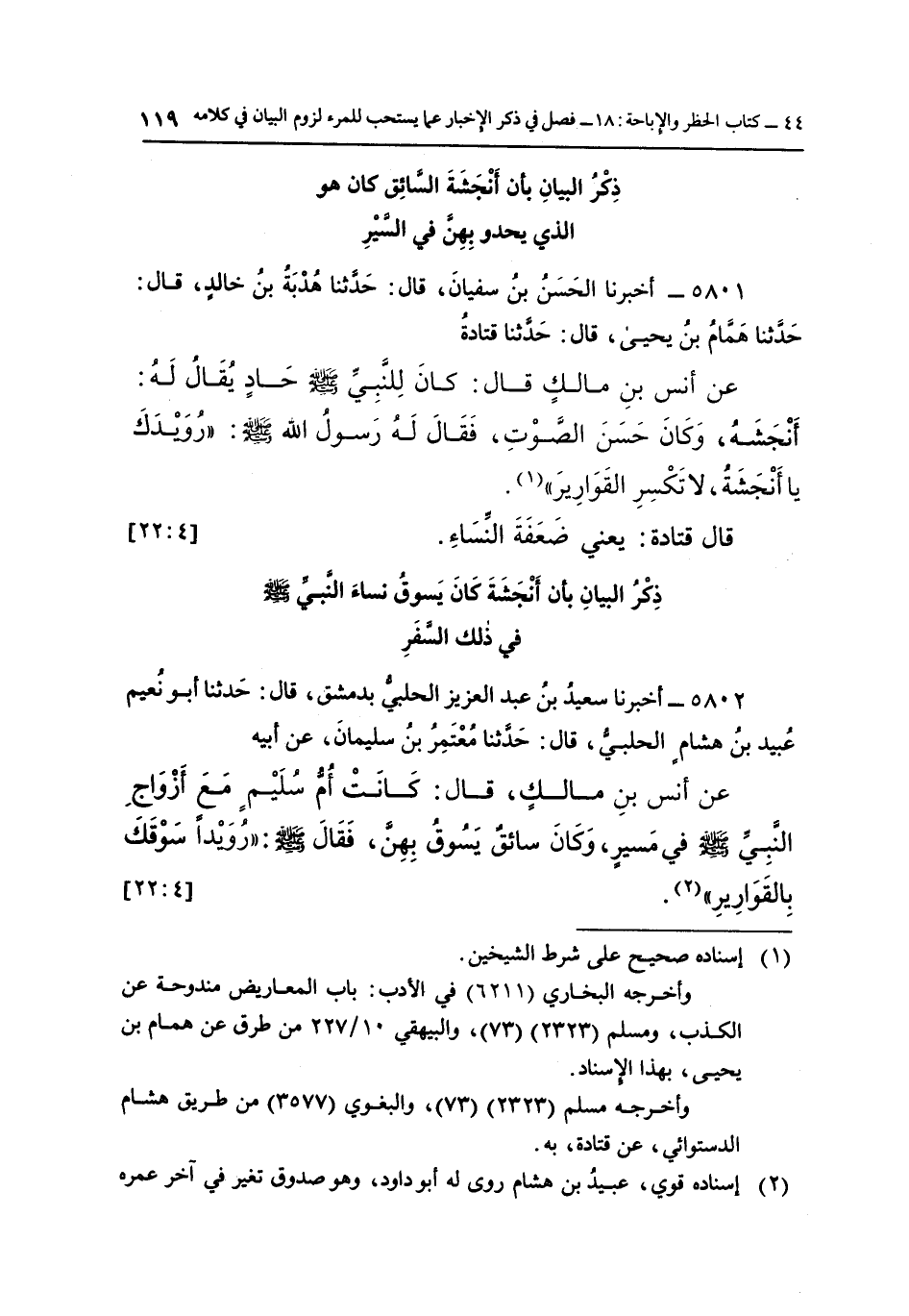 عَنْ أَنَسِ بْنِ مَالِكٍ قَالَ: كَانَ لِلنَّبِيِّ صَلَّى اللَّهُ عَلَيْهِ وَسَلَّمَ حادٍ يُقَالُ لَهُ أَنْجَشَةُ، وَكَانَ حَسَنَ الصَّوْتِ، فَقَالَ: لَهُ رَسُولُ اللَّهِ صَلَّى اللَّهُ عَلَيْهِ وَسَلَّمَ: "رُوَيْدَكَ يَا أَنْجَشَةُ لَا تَكْسِرِ الْقَوَارِيرَ" 1 [22:4]