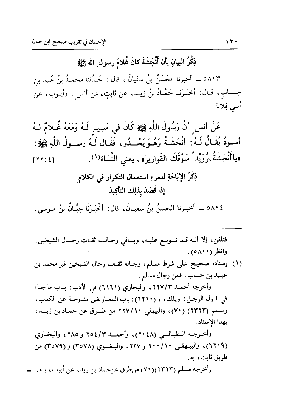 5803 ـ أَخْبَرَنَا الْحَسَنُ بْنُ سُفْيَانَ، قَالَ: حَدَّثَنَا مُحَمَّدُ بْنُ عُبَيْدِ بْنِ حِسَابٍ، قَالَ: أَخْبَرَنَا حَمَّادُ بْنُ زَيْدٍ، عَنْ ثَابِتٍ، عَنْ أَنَسِ، وَأَيُّوبَ، عَنْ أَبِي قِلَابَةَ