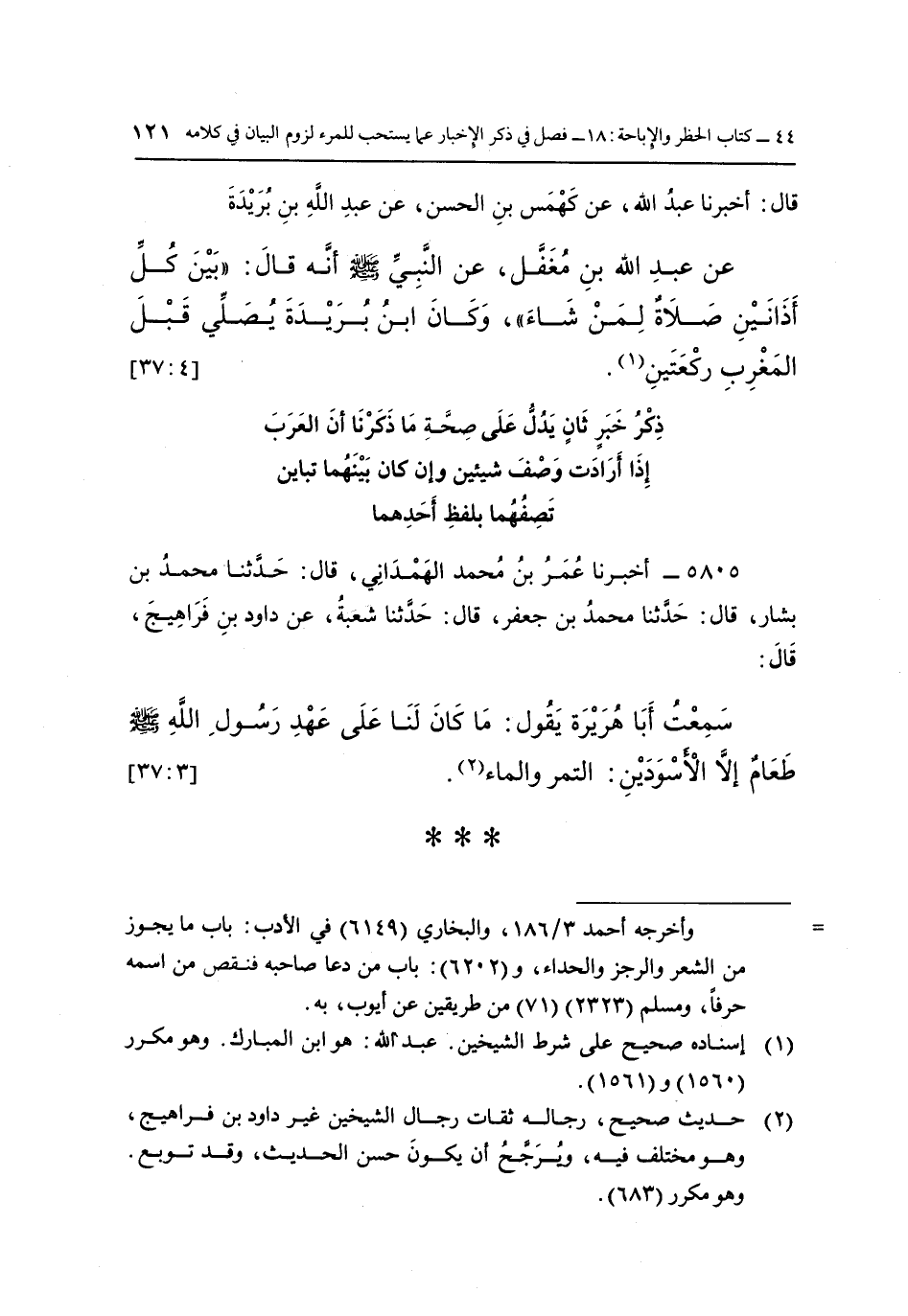 5805 ـ أَخْبَرَنَا عُمَرُ بْنُ مُحَمَّدٍ الْهَمَذَانِيُّ، قَالَ: حَدَّثَنَا مُحَمَّدُ بْنُ بَشَّارٍ، قَالَ: حَدَّثَنَا مُحَمَّدُ بْنُ جَعْفَرٍ، قَالَ: حَدَّثَنَا شُعْبَةُ، عَنْ دَاوُدَ بْنِ فَرَاهِيجَ،
