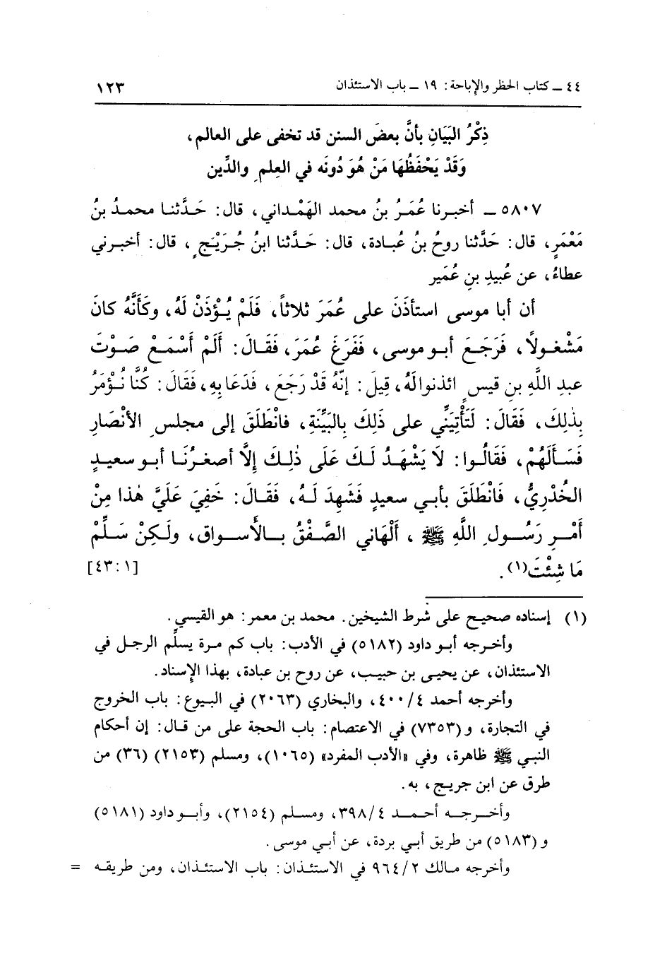 أَنَّ أَبَا مُوسَى اسْتَأْذَنَ عَلَى عُمَرَ ثَلَاثًا، فَلَمْ يُؤْذَنْ لَهُ، وَكَأَنَّهُ كَانَ مَشْغُولًا، فَرَجَعَ أَبُو مُوسَى، فَفَرَغَ عُمَرُ، فَقَالَ: أَلَمْ أَسْمَعْ صَوْتَ عَبْدِ اللَّهِ بْنِ قَيْسٍ ائْذَنُوا لَهُ، قِيلَ: إِنَّهُ قَدْ رَجَعَ، فَدَعَا بِهِ، فَقَالَ: كُنَّا نُؤْمَرُ بِذَلِكَ، فَقَالَ: لَتَأْتِيَنِّي عَلَى ذَلِكَ بِالْبَيِّنَةِ، فَانْطَلَقَ إِلَى مَجْلِسِ الْأَنْصَارِ فَسَأَلَهُمْ، فَقَالُوا: لَا يَشْهَدُ لَكَ عَلَى ذَلِكَ إِلَّا أَصْغَرُنَا أَبُو سَعِيدٍ الْخُدْرِيُّ، فَانْطَلَقَ بِأَبِي سَعِيدٍ فَشَهِدَ لَهُ، فَقَالَ: خَفِيَ عَلَيَّ هَذَا مِنْ أَمْرِ رَسُولِ اللَّهِ صَلَّى اللَّهُ عَلَيْهِ وَسَلَّمَ، أَلْهَانِي الصَّفْقُ بِالْأَسْوَاقِ، وَلَكِنْ سَلِّمْ مَا شِئْتَ1 [43:1]