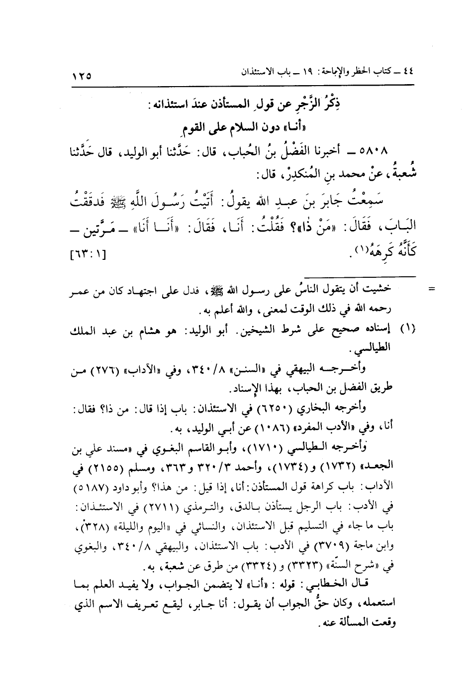 وأخرجه الطيالسي "1710"، وأبو القاسم البغوي في "مسند علي بن الجعد" "1732" و "1734"، وأحمد 3/320و363، ومسلم "2155" في الأدب: باب كراهة قول المستأذن: أنا إذا قيل: من هذا؟ وأبو داود "5187" في الأدب: باب الرجل يستأذن بالدق، والترمذي "2711" في الإستئذان: باب ما جاء في التسليم قبل الإستئذان، والنسائي في "اليوم والليلة" "328"، وابن ماجه "3709" في الأدب: باب الإستئذان، والبيهقي 8/340، والبغوي في "شرح السنة" "3323"و "3324" من طرق عن شعبة، به.